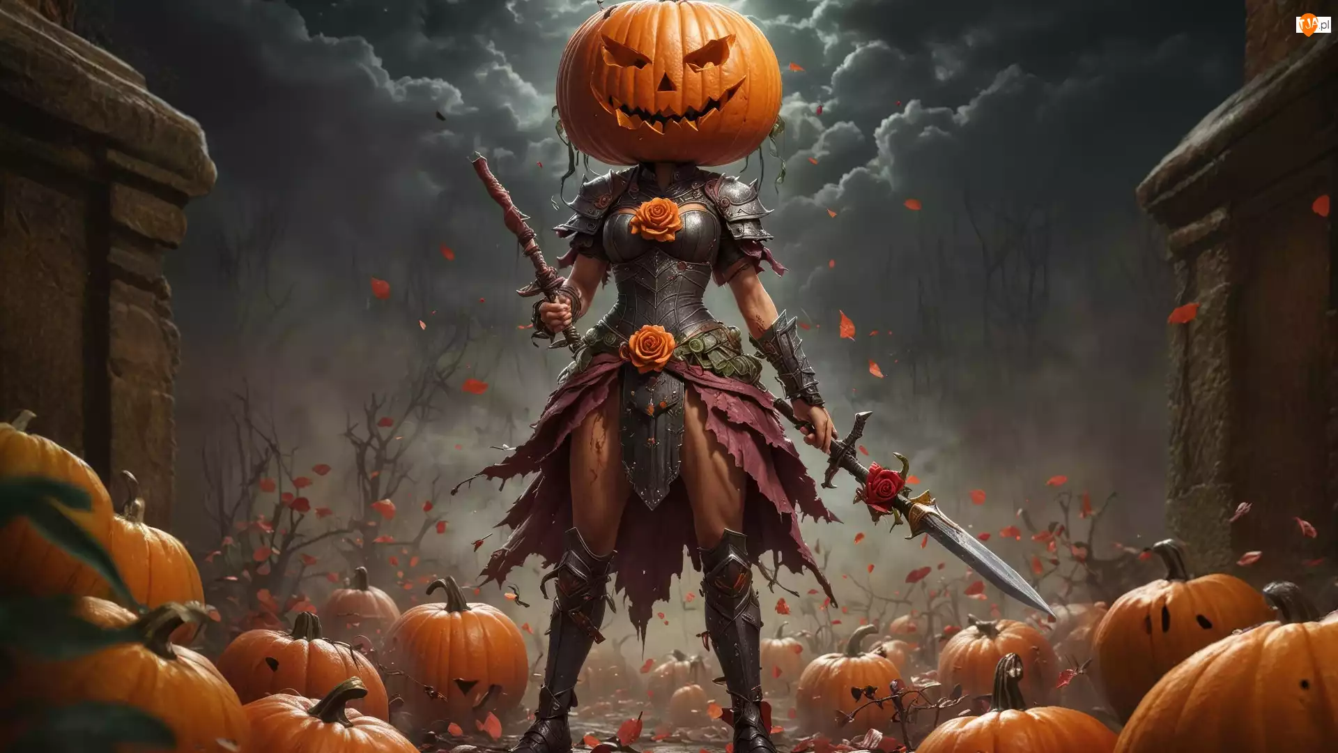 Halloween, Dynie, Mury, Grafika, Miecz, Zbroja, Postać