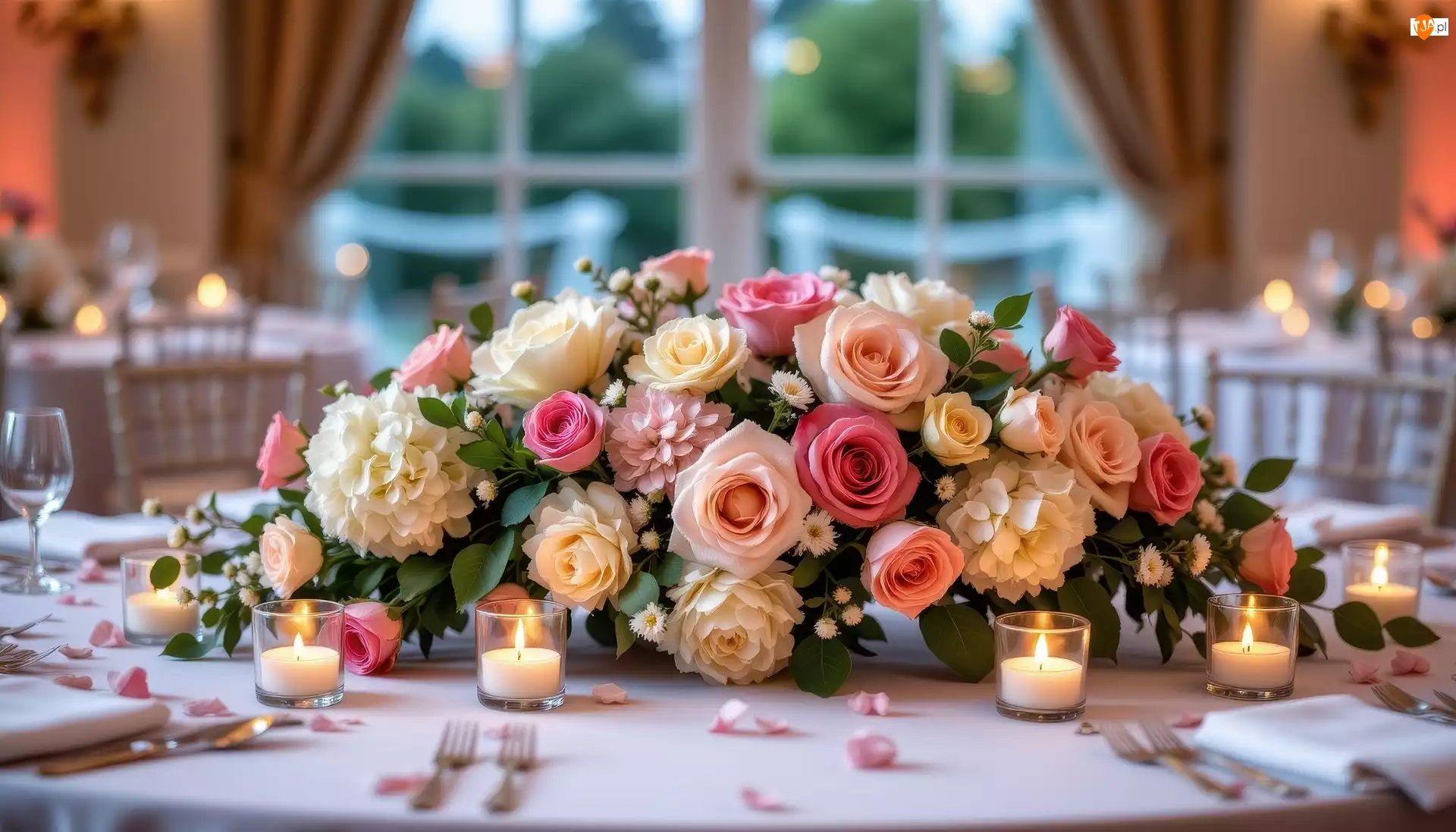 Hortensje, Stół, Róże, Kwiaty, Świece