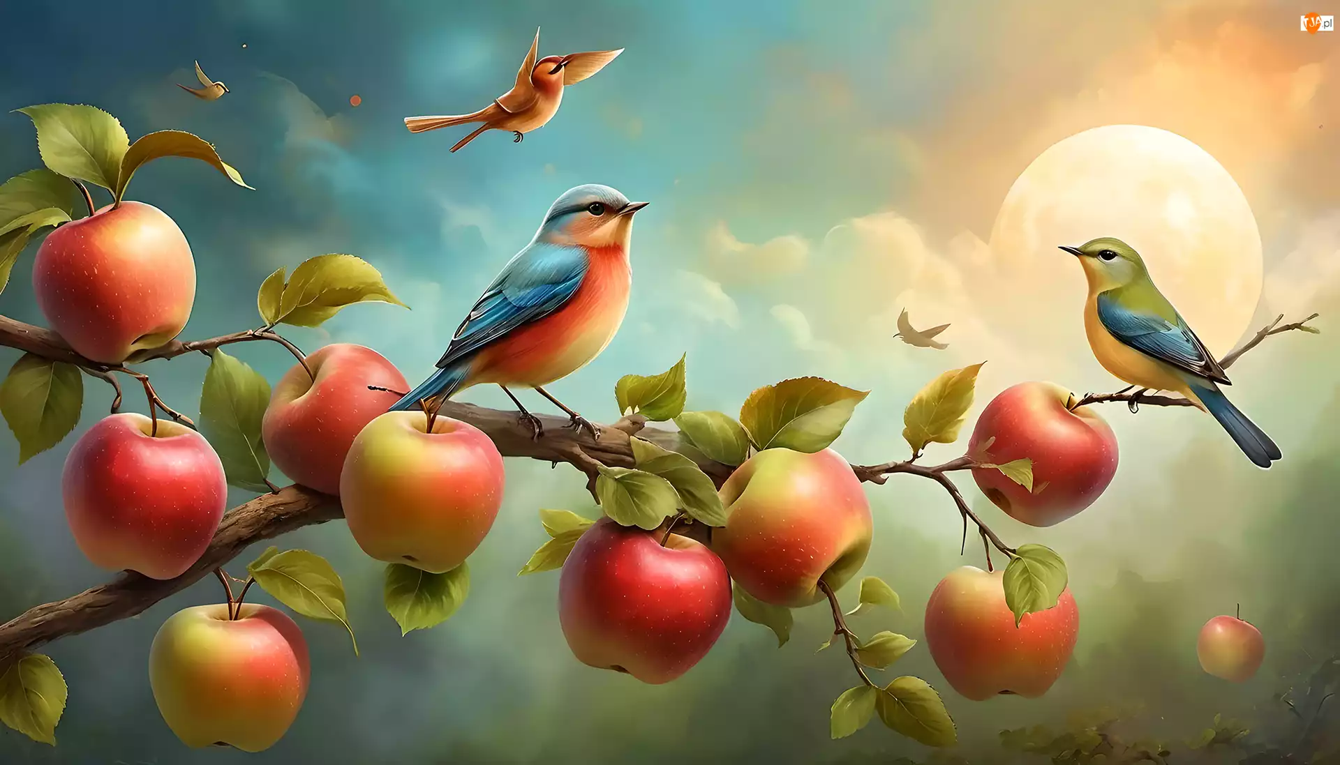 Jabłka, Grafika, Ptaki, Kolorowe, Gałąź
