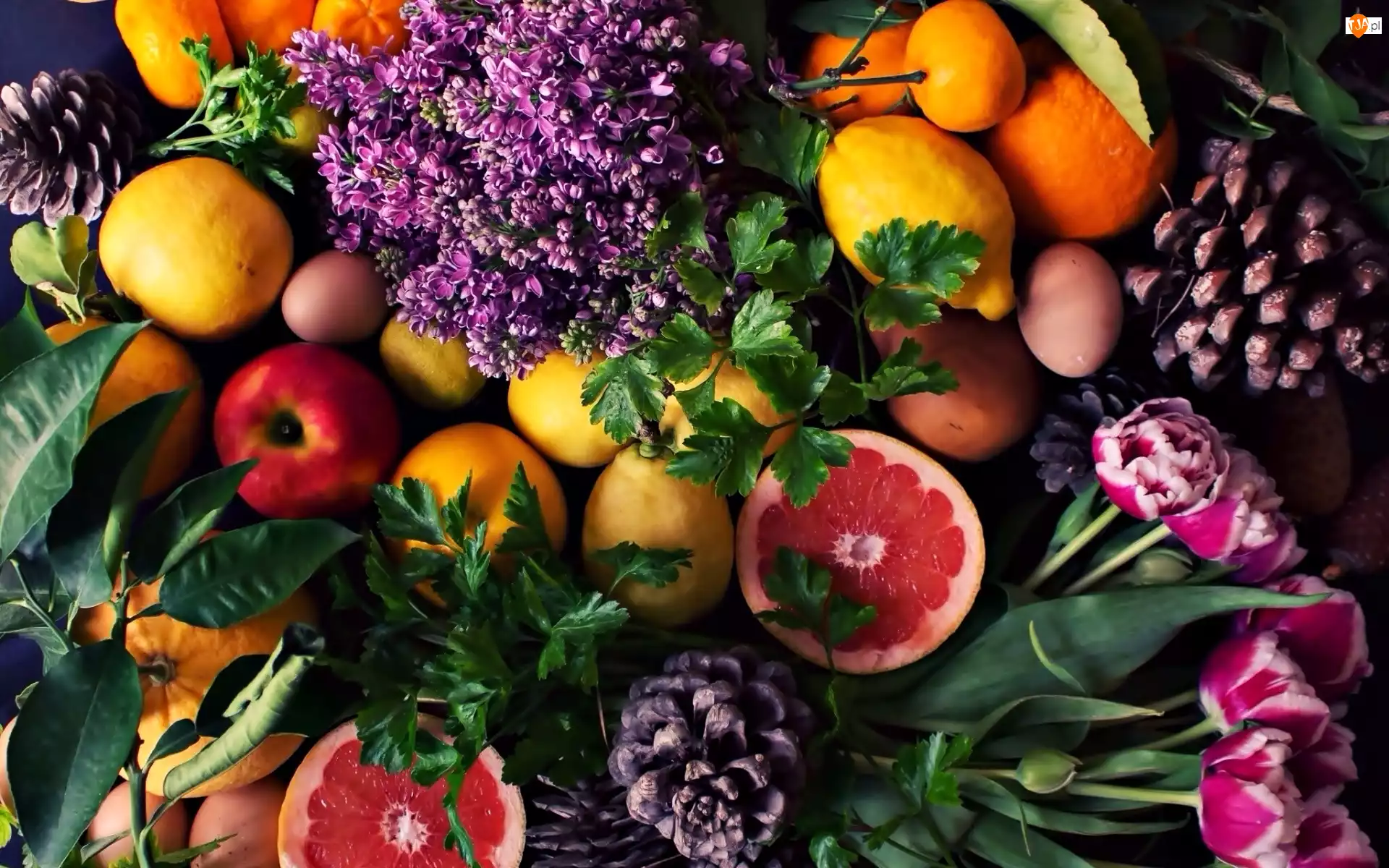 Cytryny, Jabłka, Bzy, Tulipany, Pomarańcze