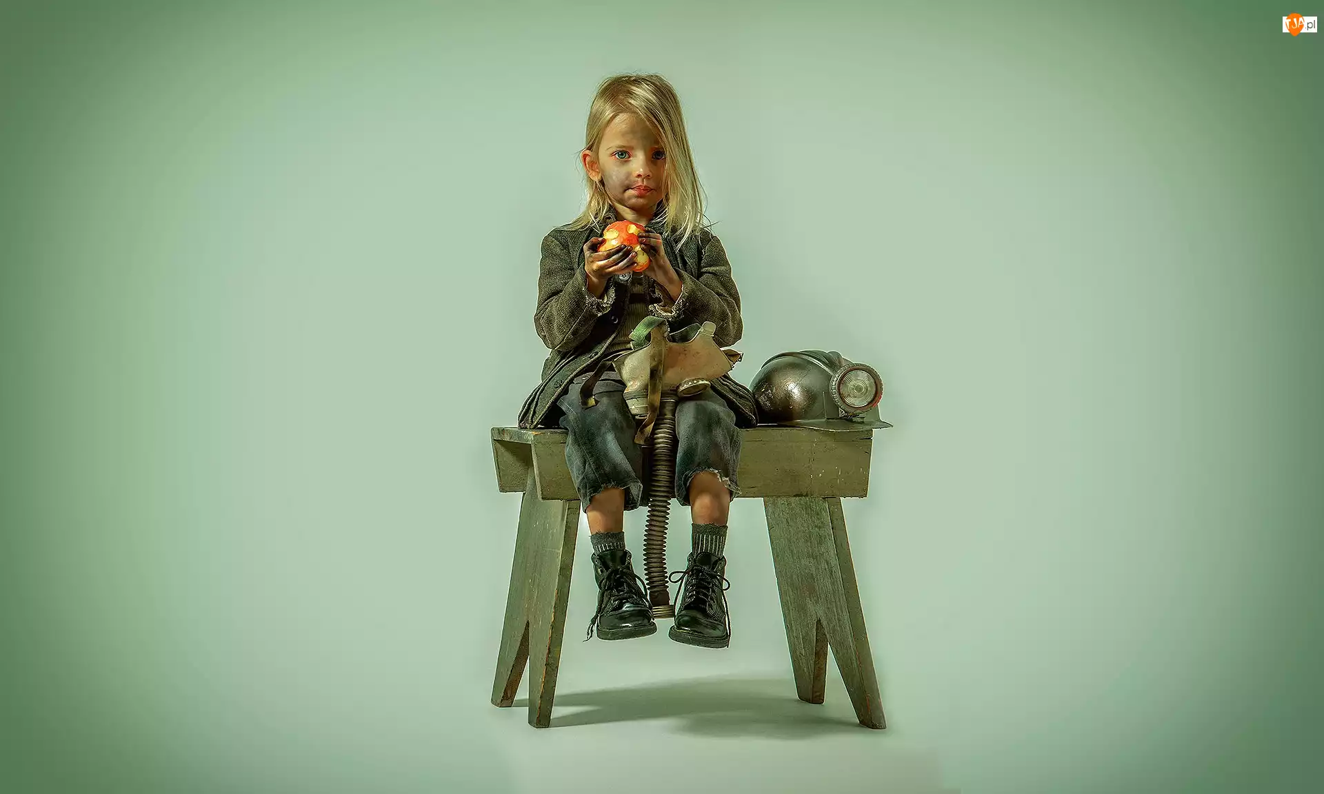 Jabłko, Krzesło, Dziewczynka, Dziecko, Kask