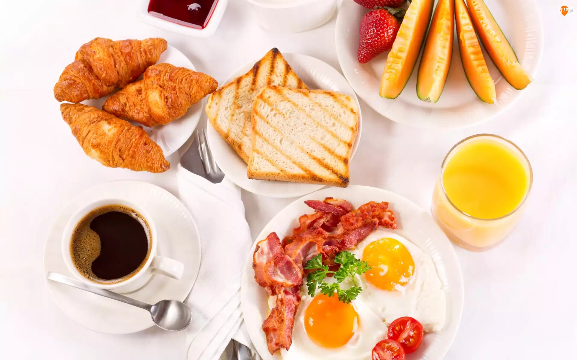 Tosty, Rogaliki, Kawa, Śniadanie, Sok, Boczek, Jajka