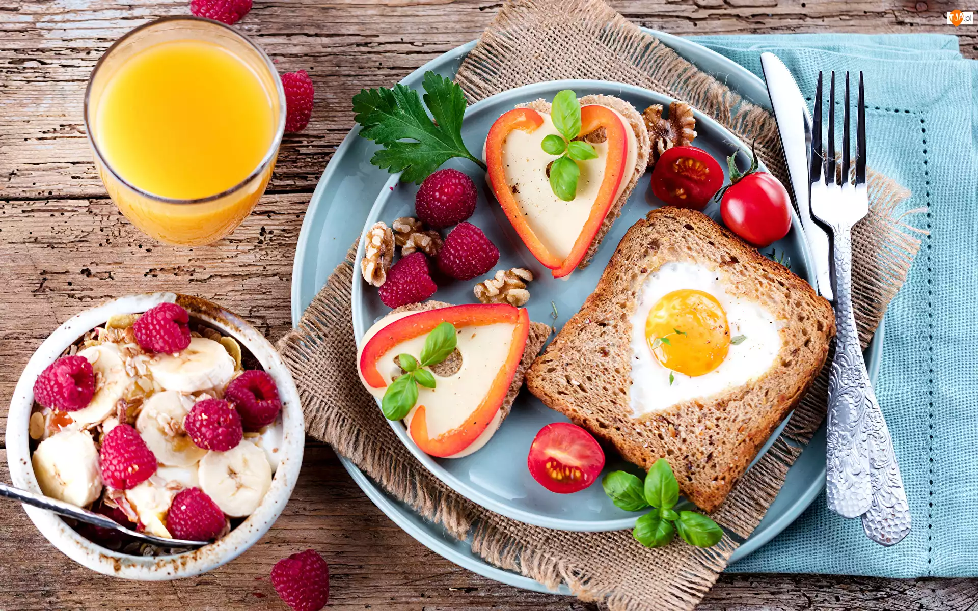 Jajko, Śniadanie, Banany, Kanapki, Maliny, Owoce, Sok