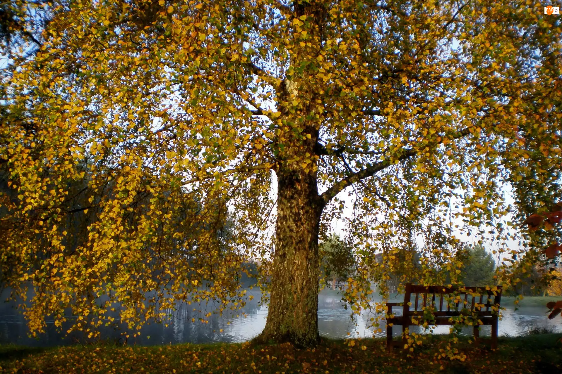 Jesień, Rzeka, Ławka, Drzewa, Liście