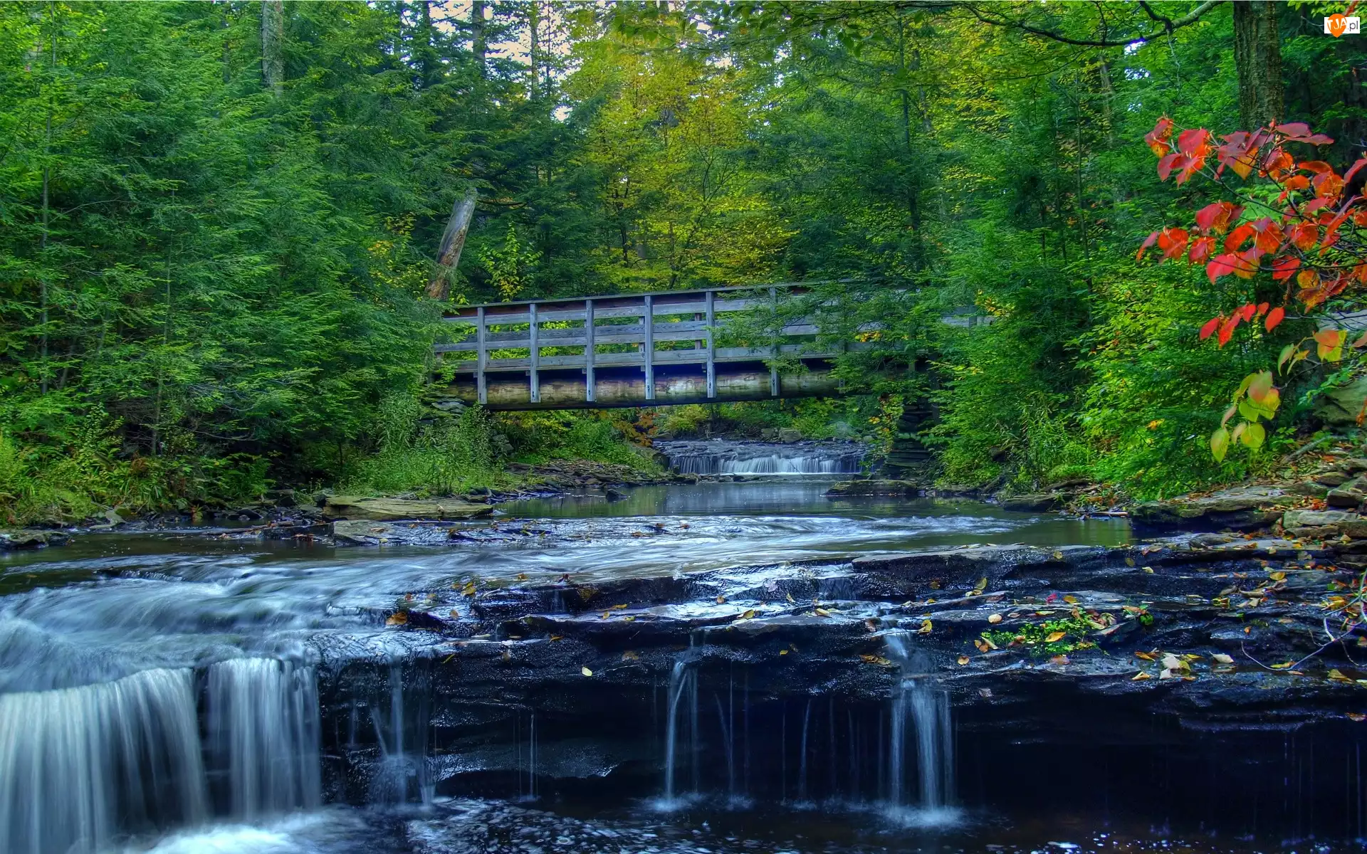 Jesień, Wodospad, Most, Rzeka, Las