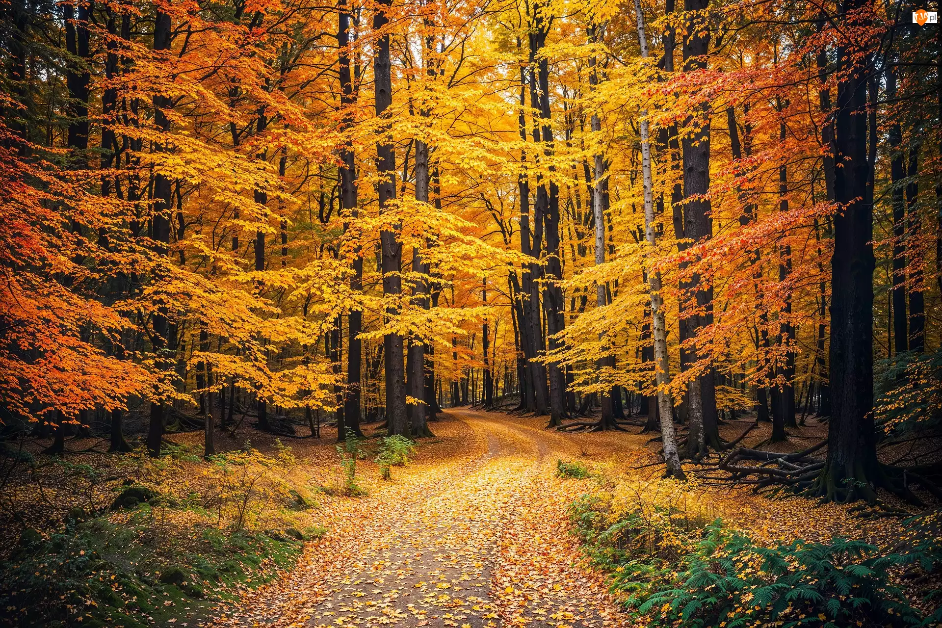 Drzewa, Las, Droga, Jesień, Liście, Leśna