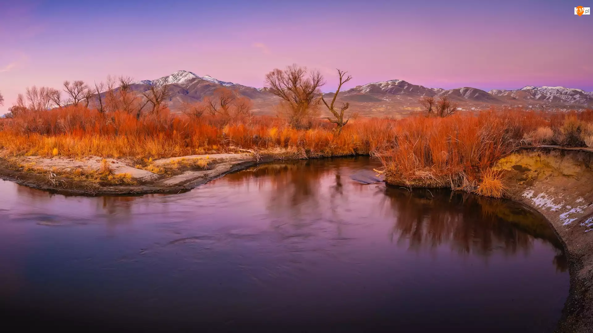 Stany Zjednoczone, Owens River, Eastern Sierra, Rzeka, Jesień, Góry, Rośliny, Drzewa, Dolina Owens Valley, Kalifornia