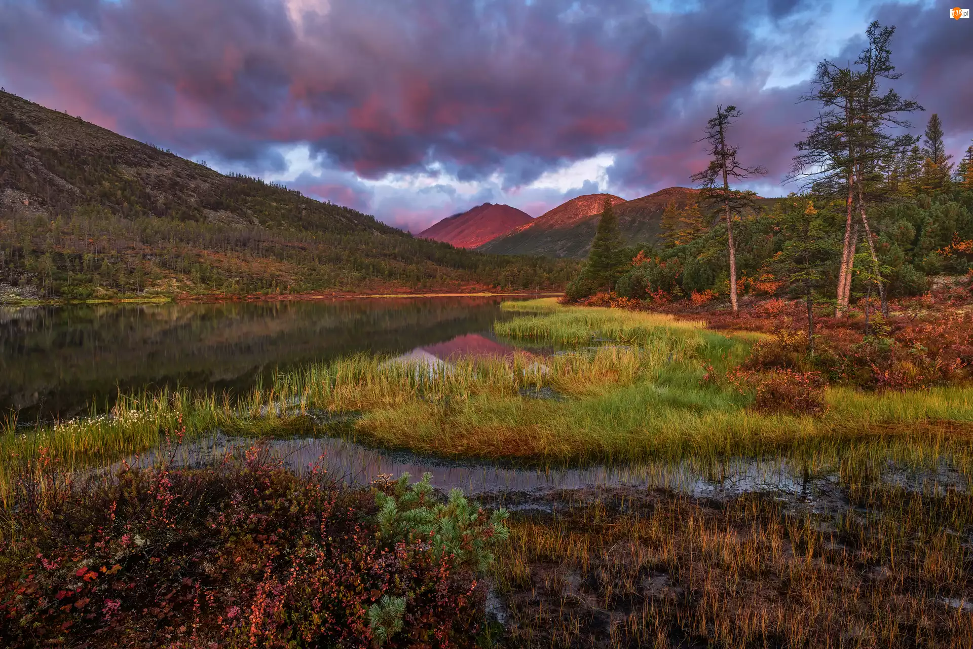 Rosja, Chmury, Kołyma, Trawa, Góry Kołymskie, Jesień, Jack London Lake, Jezioro, Drzewa, Obwód magadański