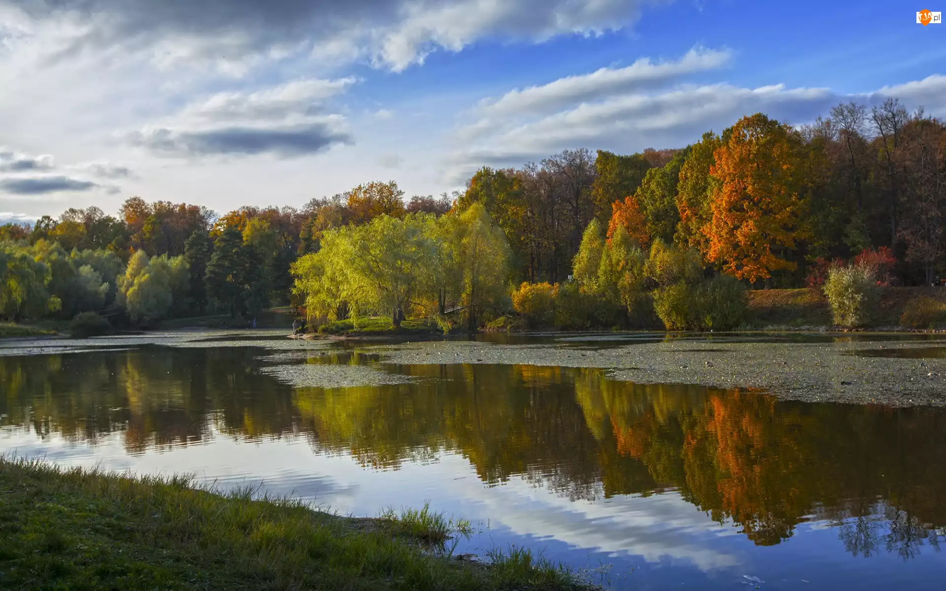 Drzewa, Park, Trawa, Jesień, Brzeg, Odbicie, Staw