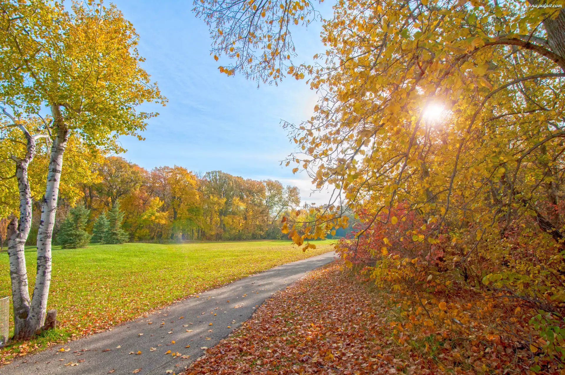 Drzewa, Promienie, Jesień, Słońca, Droga, Brzozy