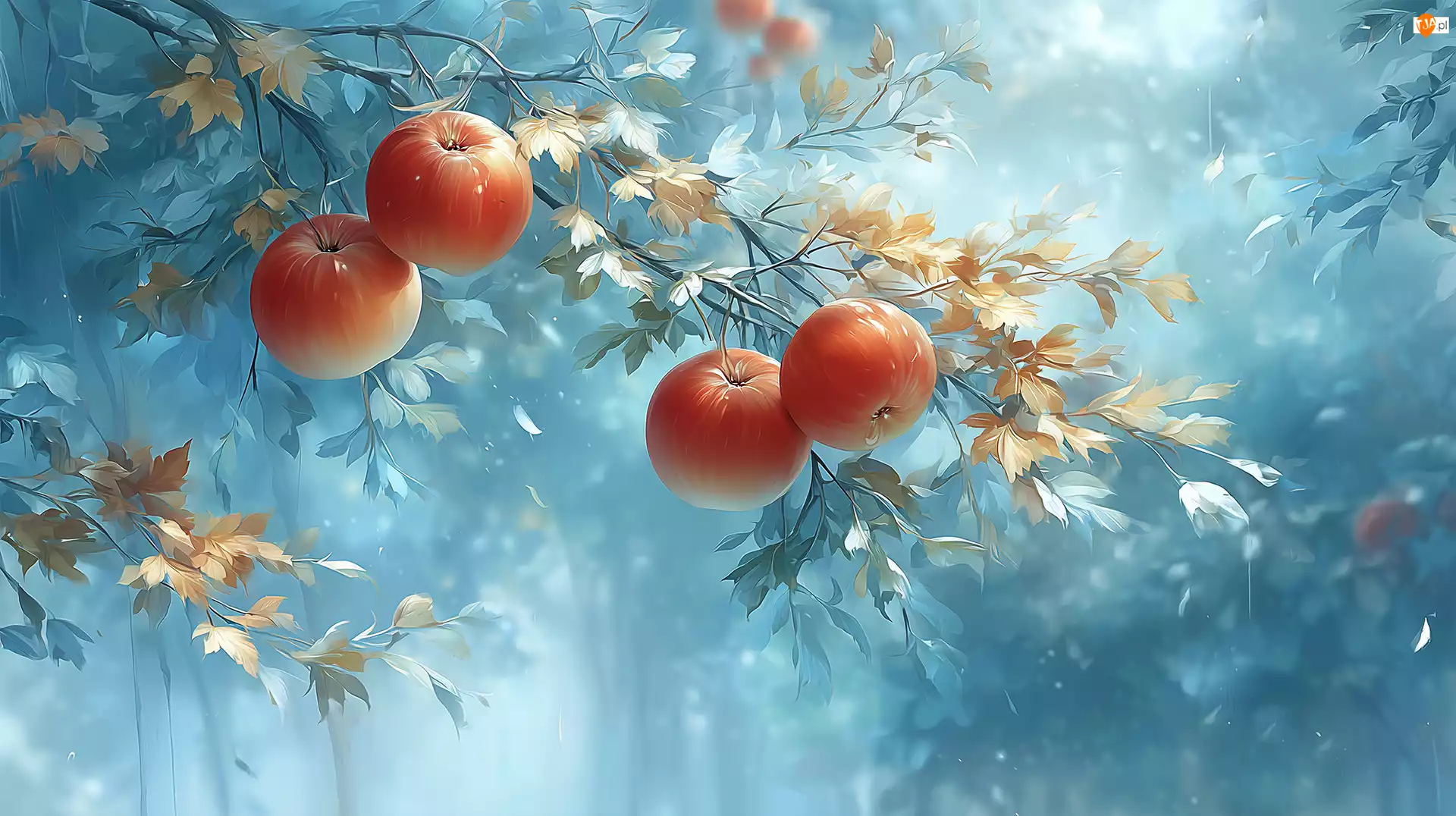 Jesienne, Grafika AI, Jabłka, Cztery, Liście