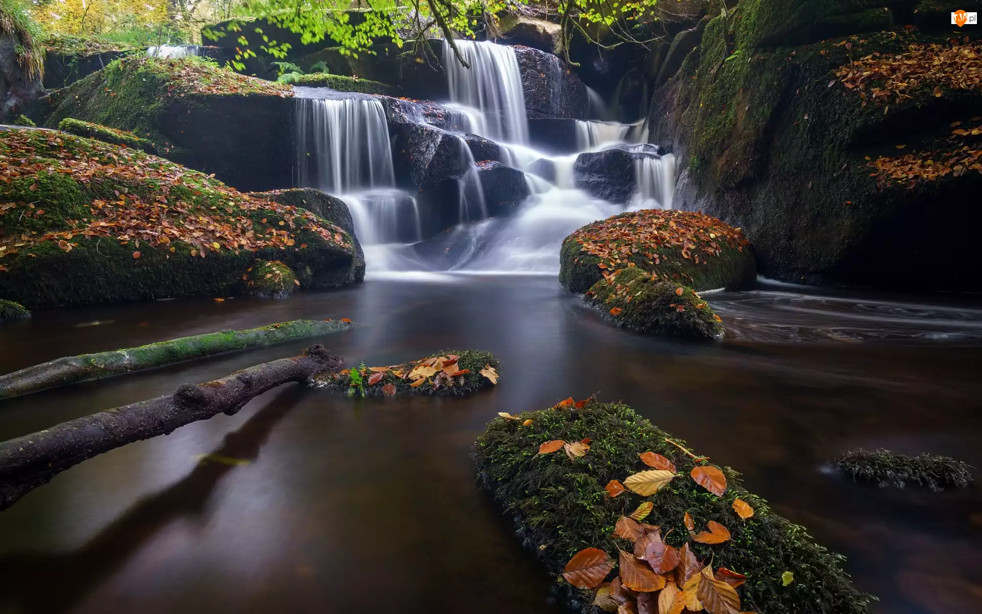 Jesień, Rzeka, Skały, Kamienie, Bretania, Wodospad, Liście, Francja, Omszałe, Saint-Herbot, Roślinność