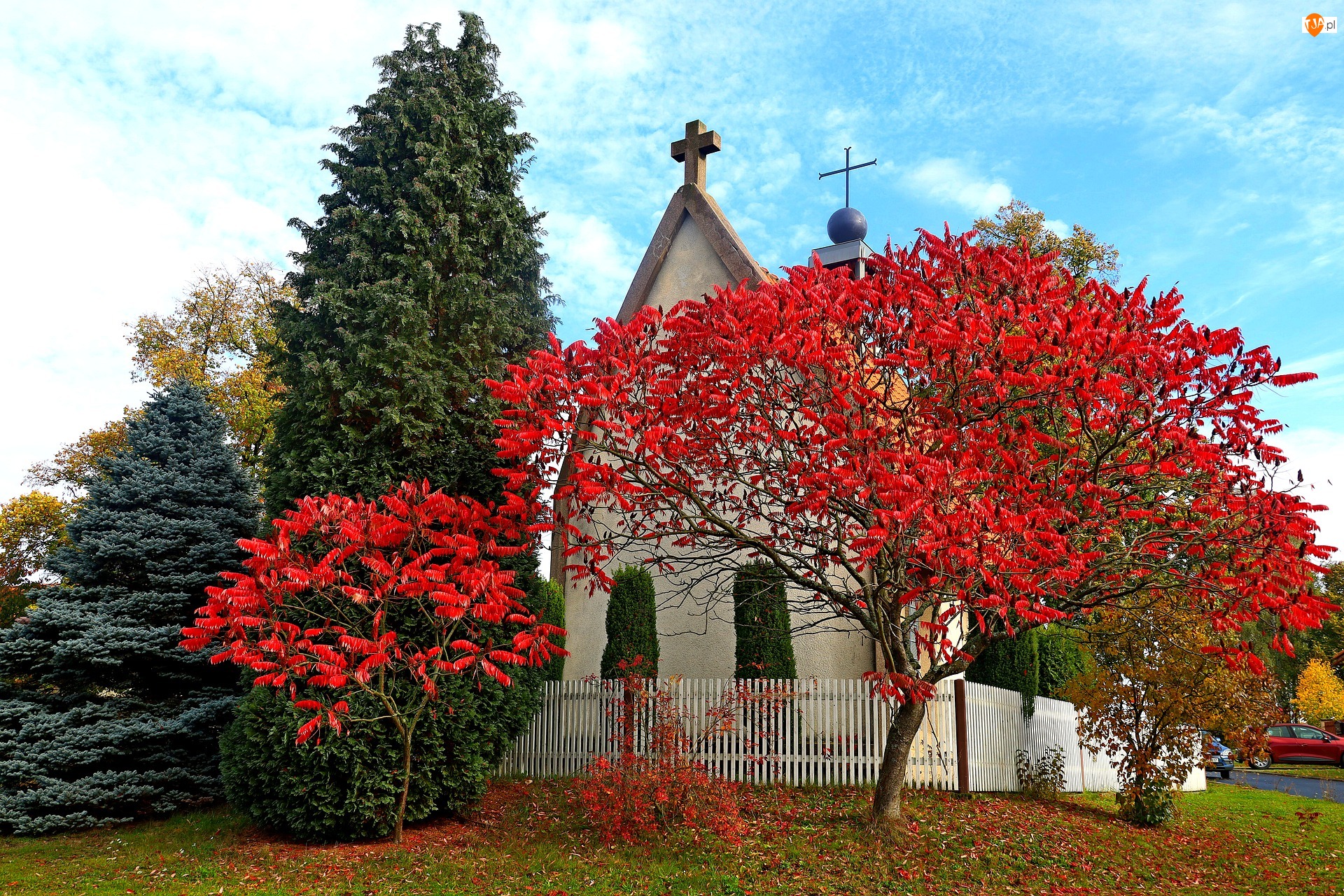 Jesienny sumak ostrowiec i tuja obok kościółka