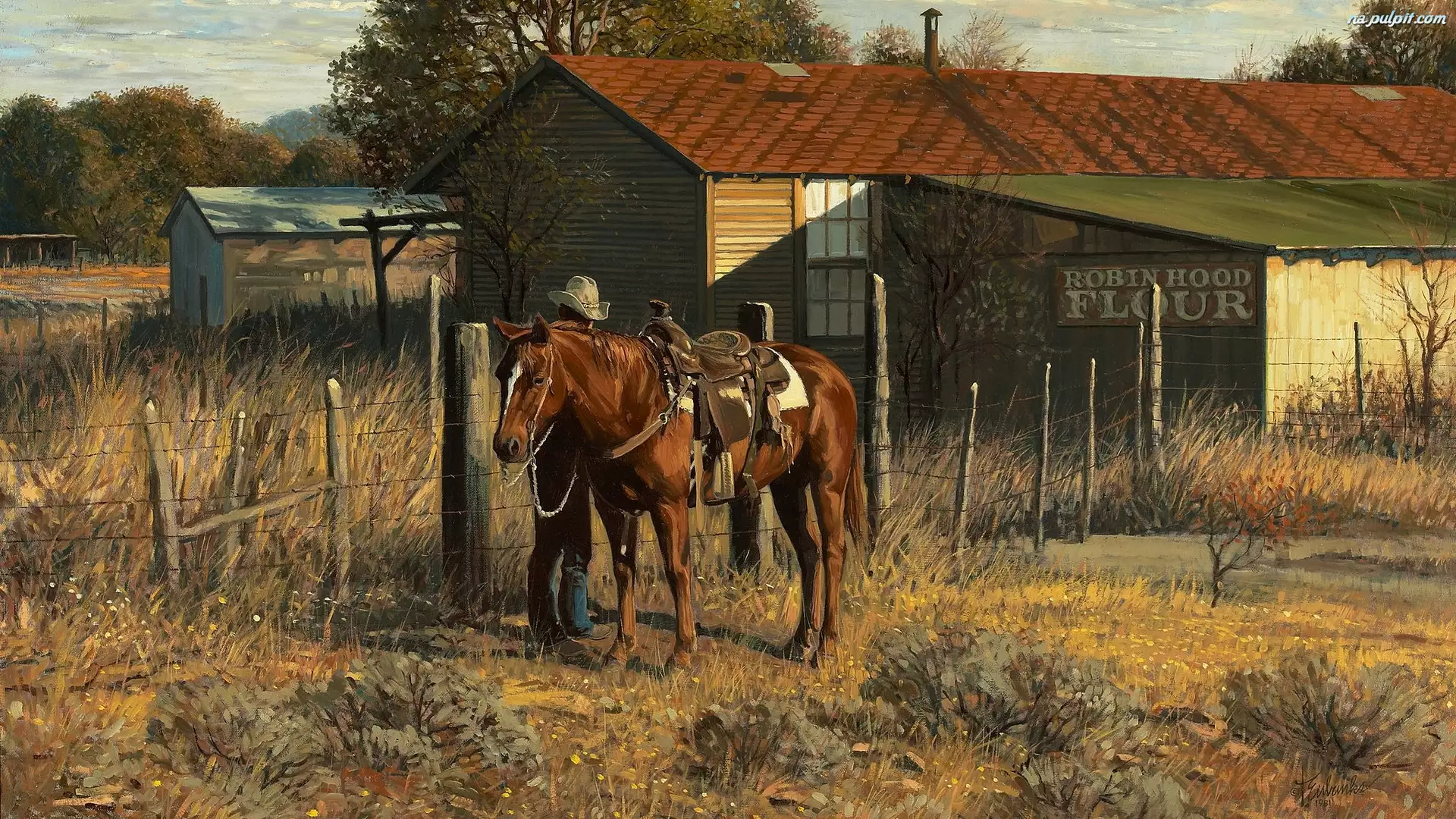 Obraz, Tony Eubanks, Budynki, Malarstwo, Pastwisko, Koń, Jeździec
