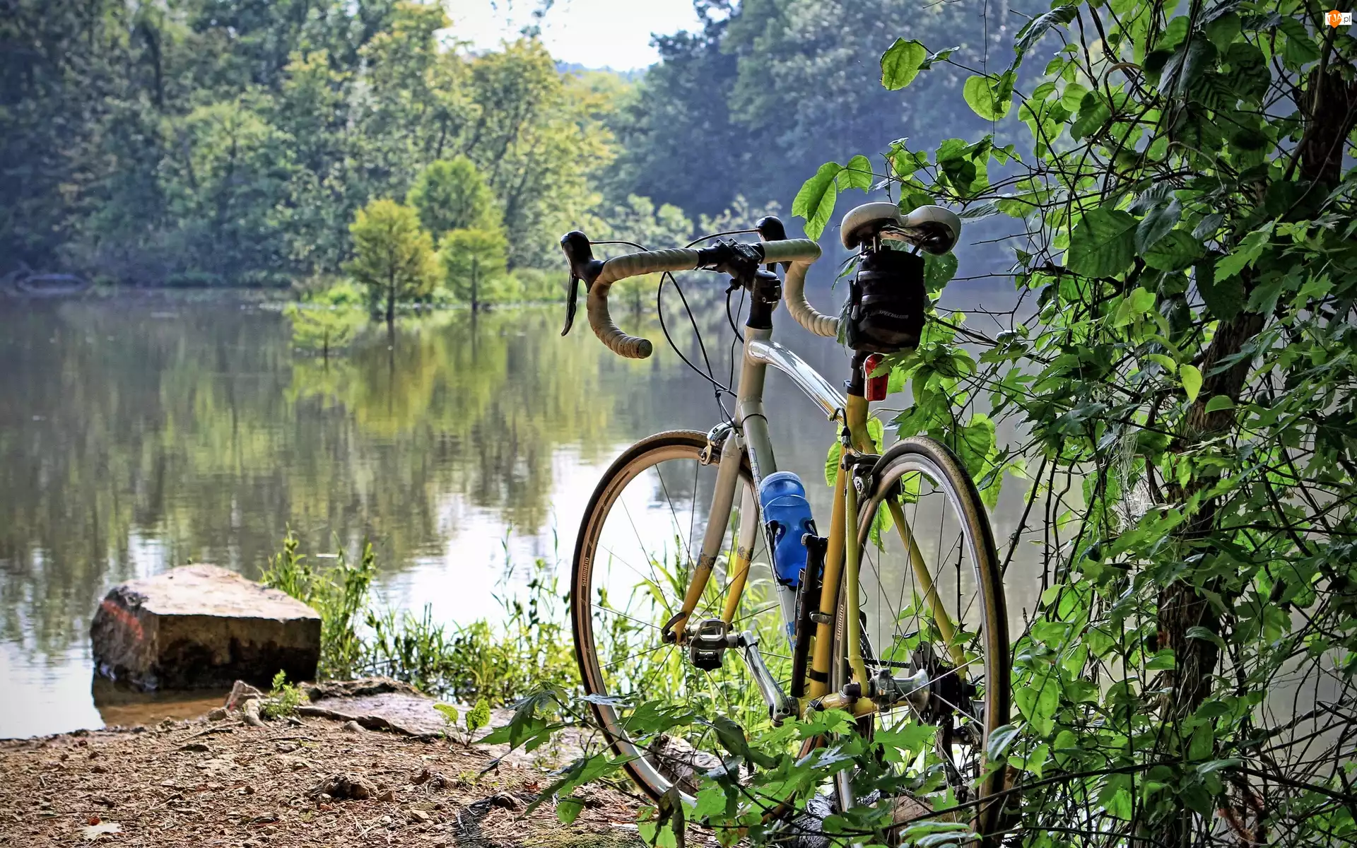 Jeziora, Lasy, Brzeg, Rower, Drzewa