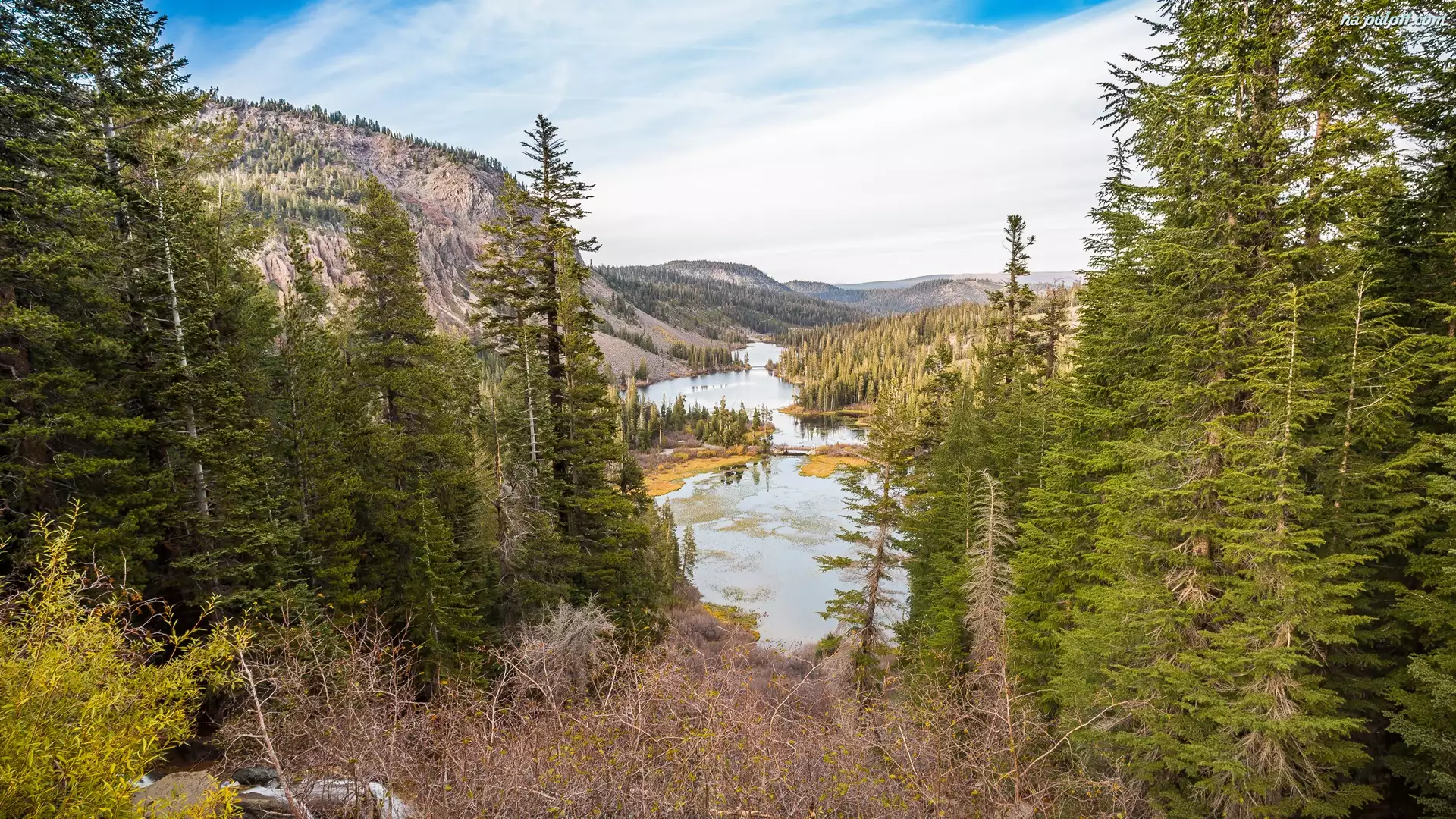 Jeziora Twin Lakes, Stany Zjednoczone, Miejscowość Mammoth Lakes, Góry, Kalifornia, Góra Mammoth Mountain, Świerki, Hrabstwo Mono