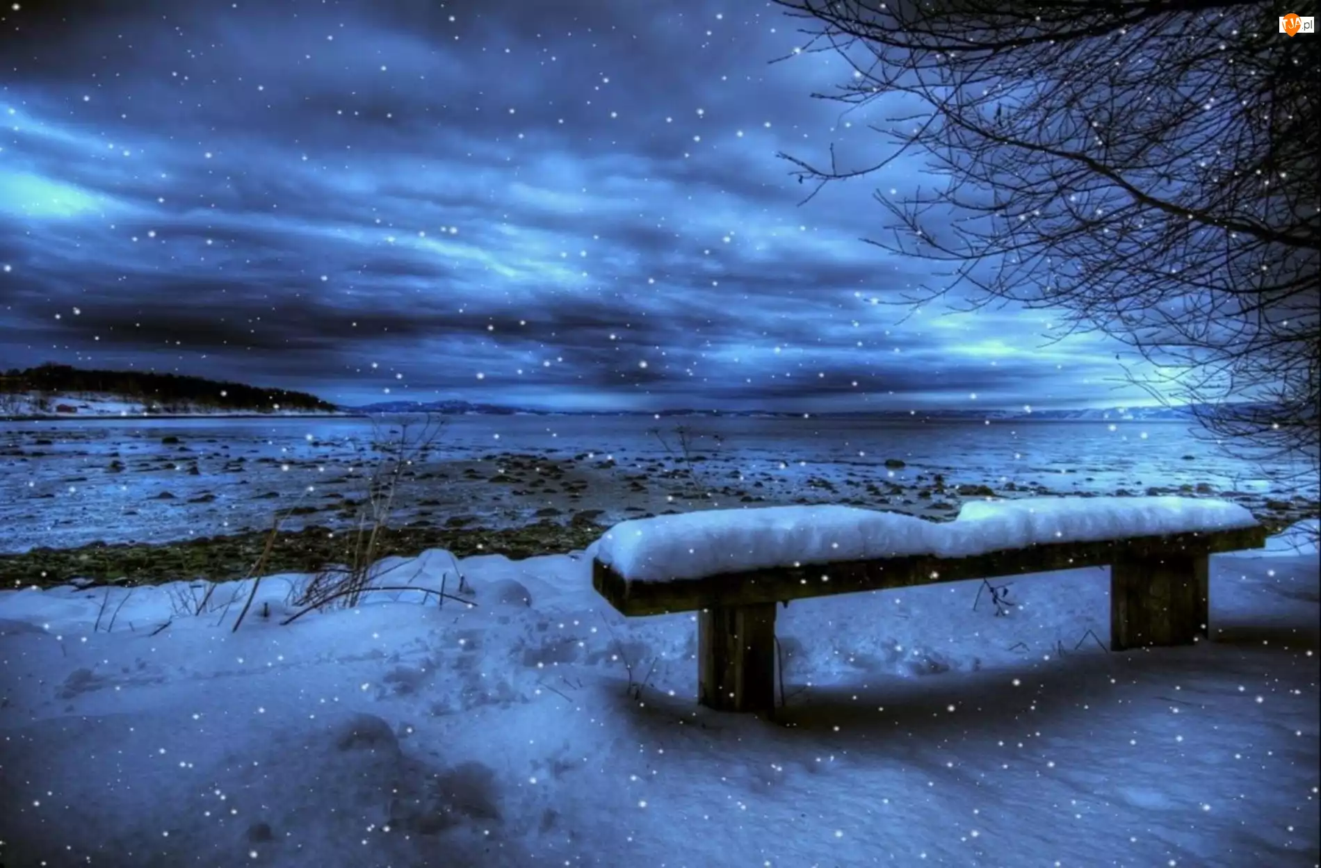 Jeziorem, Niebo, Ławka, Zima, Nad