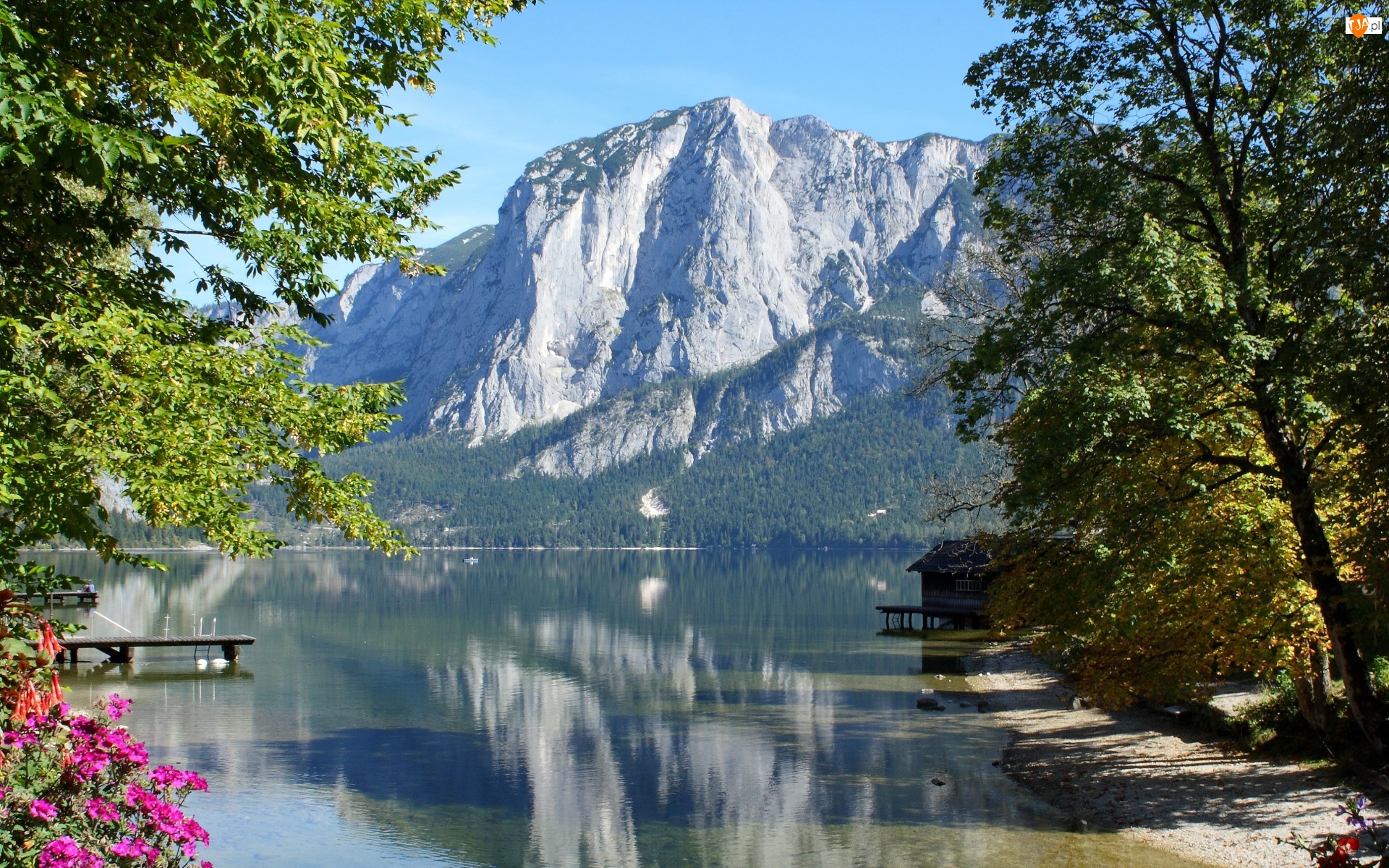 Styria, Jezioro, Drzewa, Austria, Alpy, Góry, Altaussee