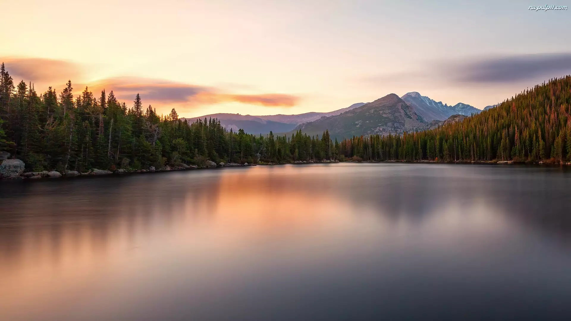 Jezioro Bear Lake, Park Narodowy Gór Skalistych, Stany Zjednoczone, Góry Skaliste, Kolorado, Drzewa, Kamienie