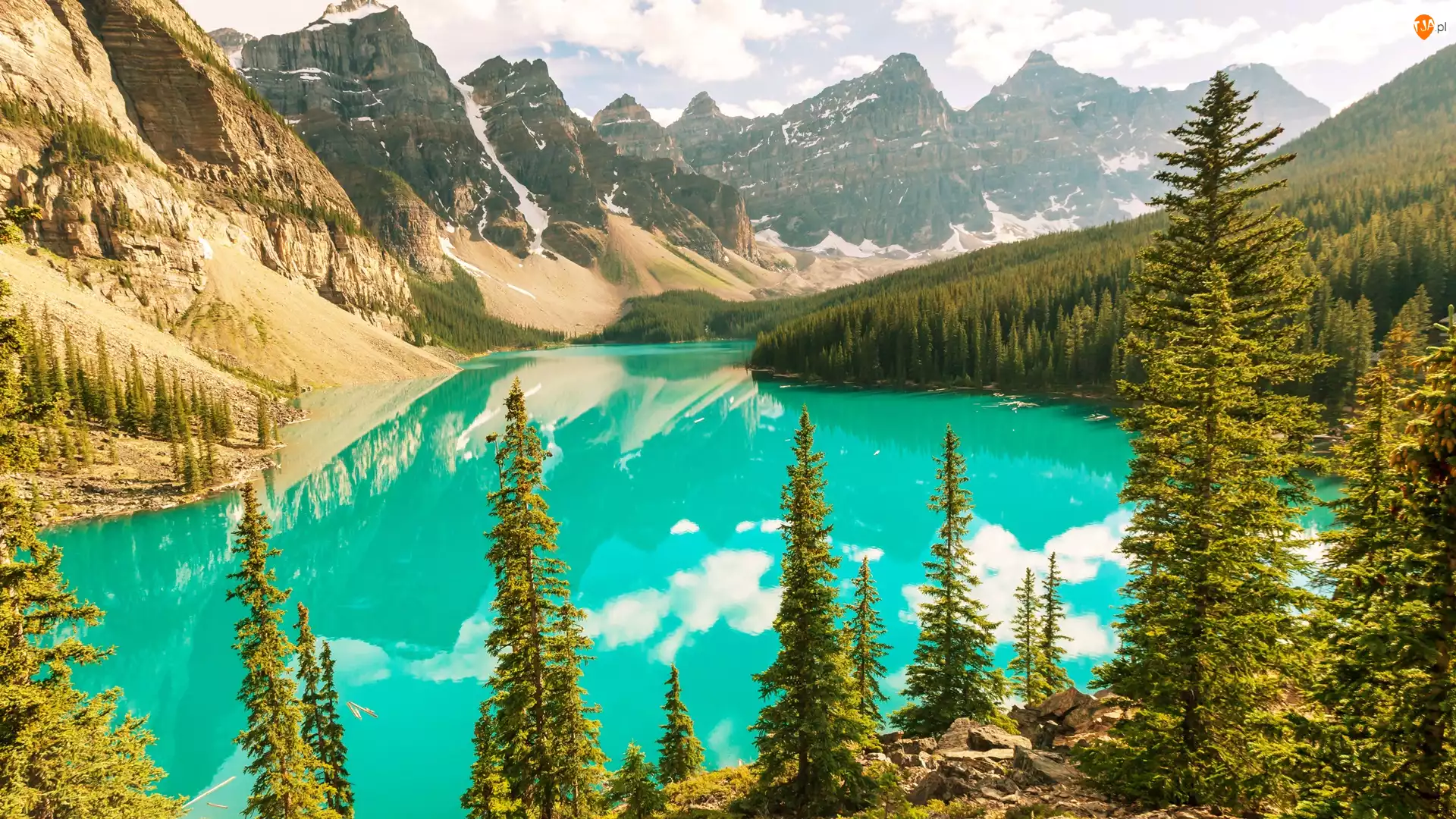 Prowincja Alberta, Park Narodowy Banff, Góry, Kanada, Drzewa, Dolina Dziesięciu Szczytów, Jezioro Moraine