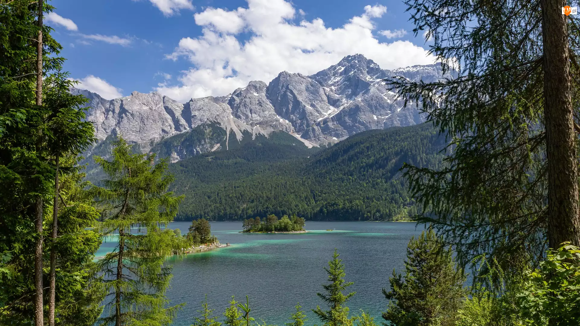 Jezioro, Góry, Drzewa, Niemcy, Eibsee, Sosny