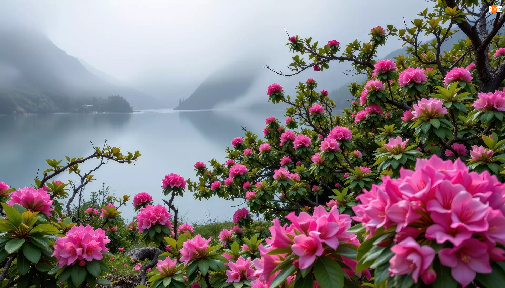 Jezioro, Grafika, Kwiaty, Rododendrony, Mgła