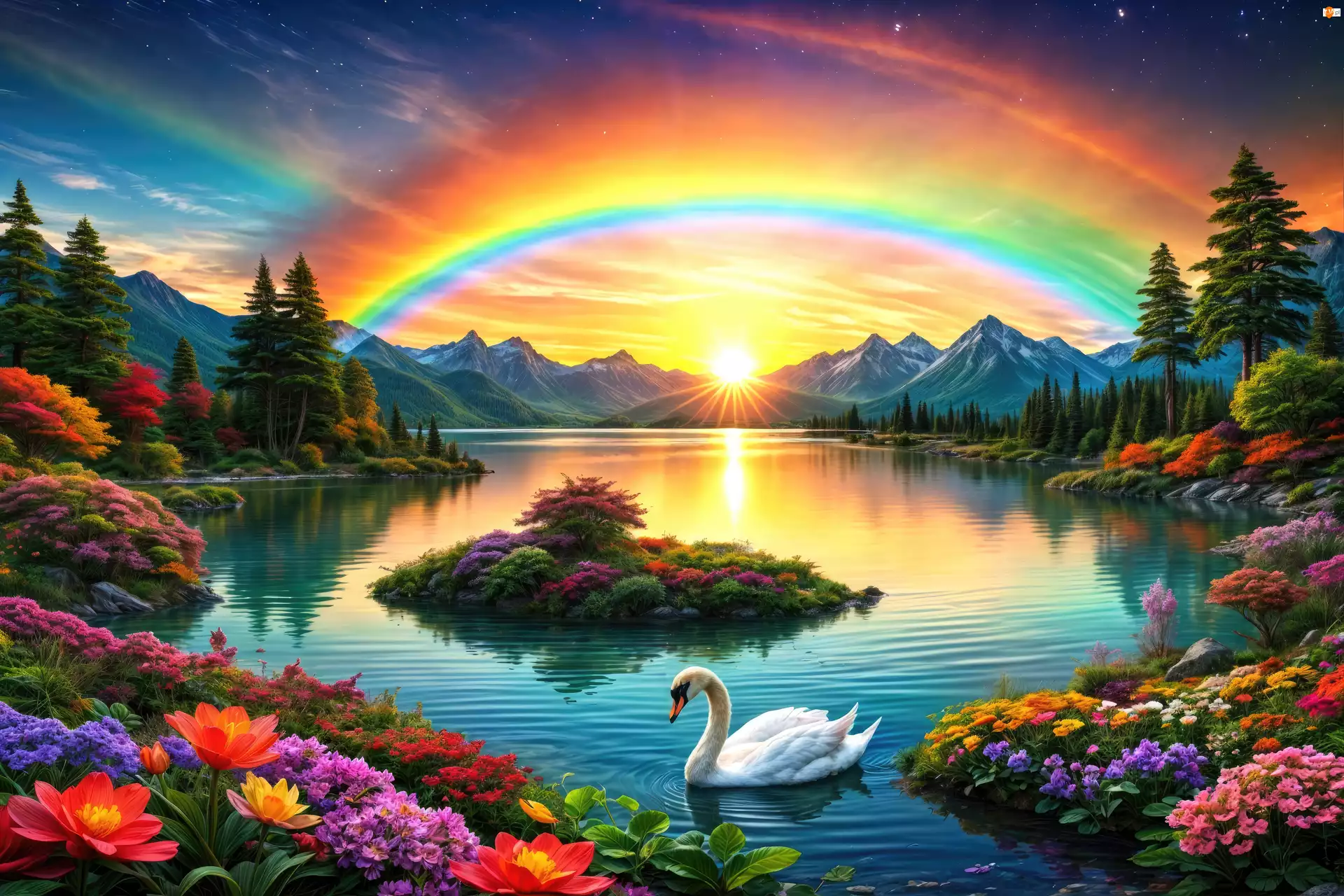 Jezioro, Kwiaty, Góry, Grafika, Łabędź, Tęcza