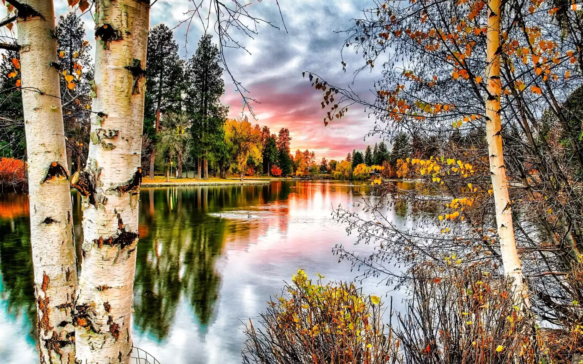 Jezioro, Odbicie, Brzozy, Drzewa, Jesień