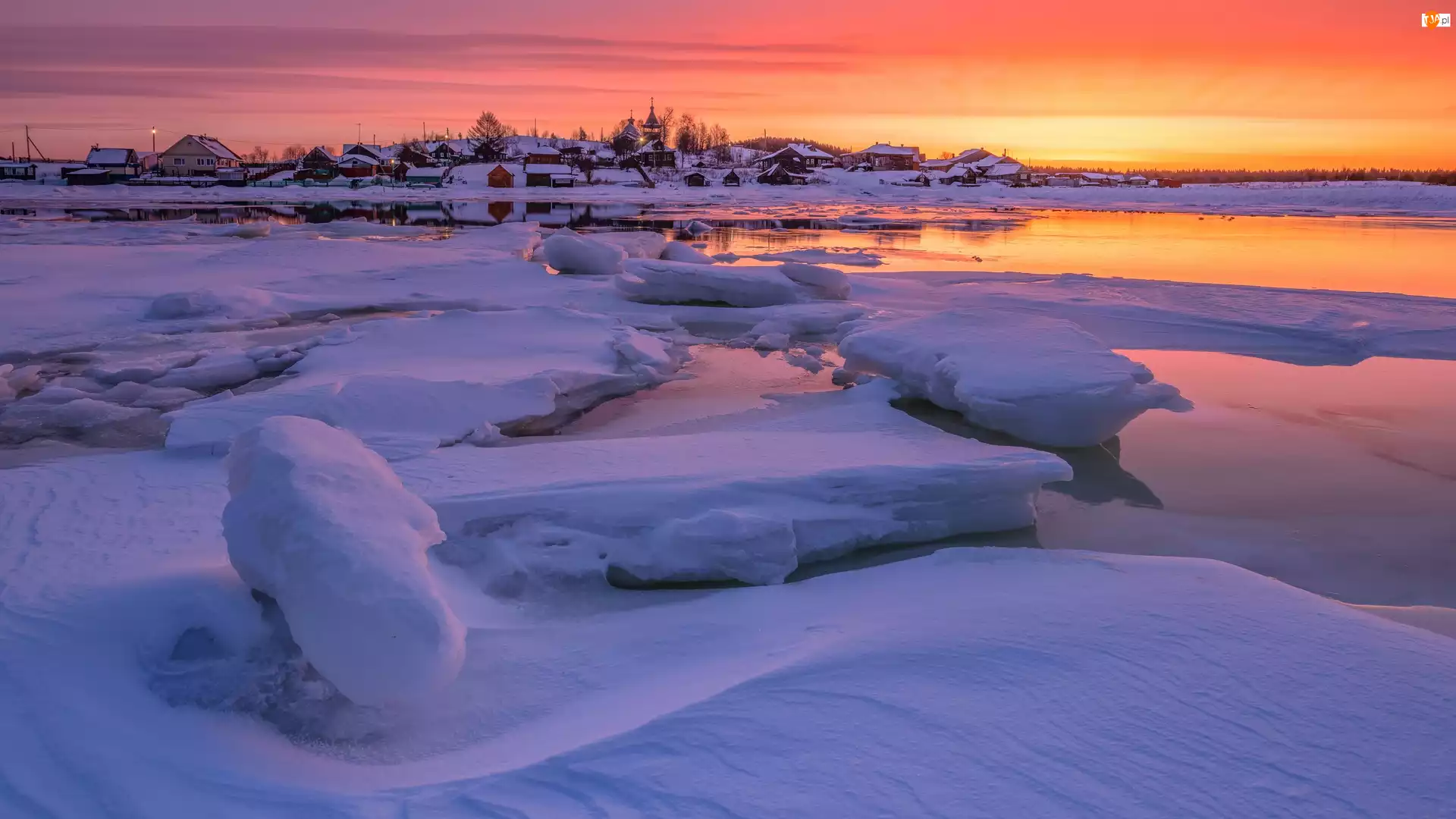 Jezioro, Ośnieżone, Wschód słońca, Zima, Kry