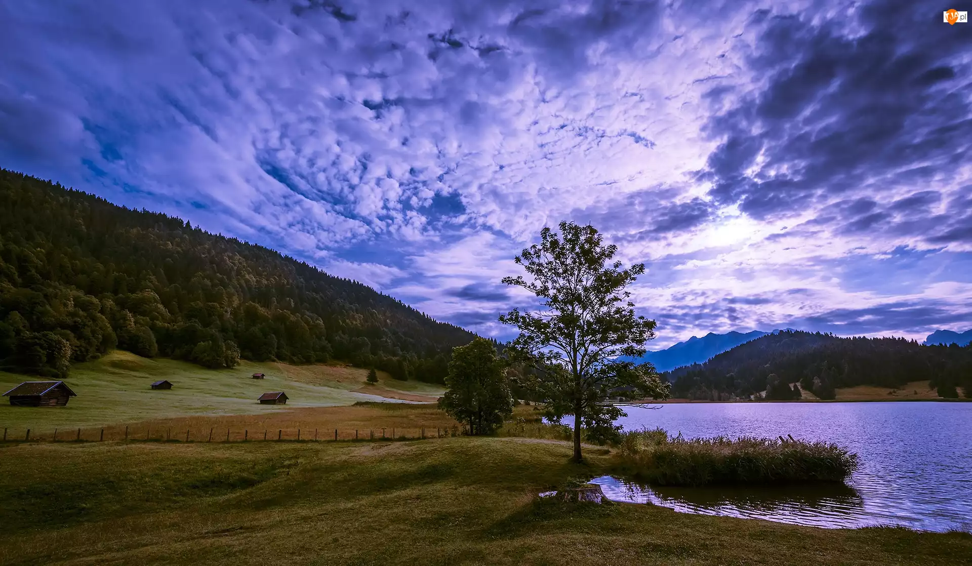 Wzgórze, Domki, Niebo, Drzewo, Wagenbruchsee, Bawaria, Drewniane, Jezioro Geroldsee, Chmury, Góry Alpy, Niemcy