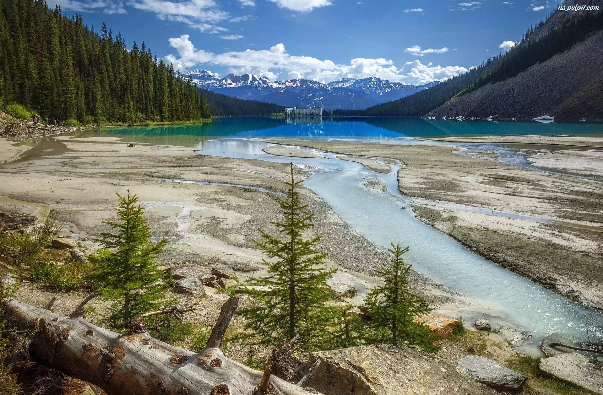 Kamienie, Miejscowość Lake Louise, Drzewa, Alberta, Jezioro Lake Louise, Kanada, Góry, Park Narodowy Banff, Hotel Chateau Lake Louise