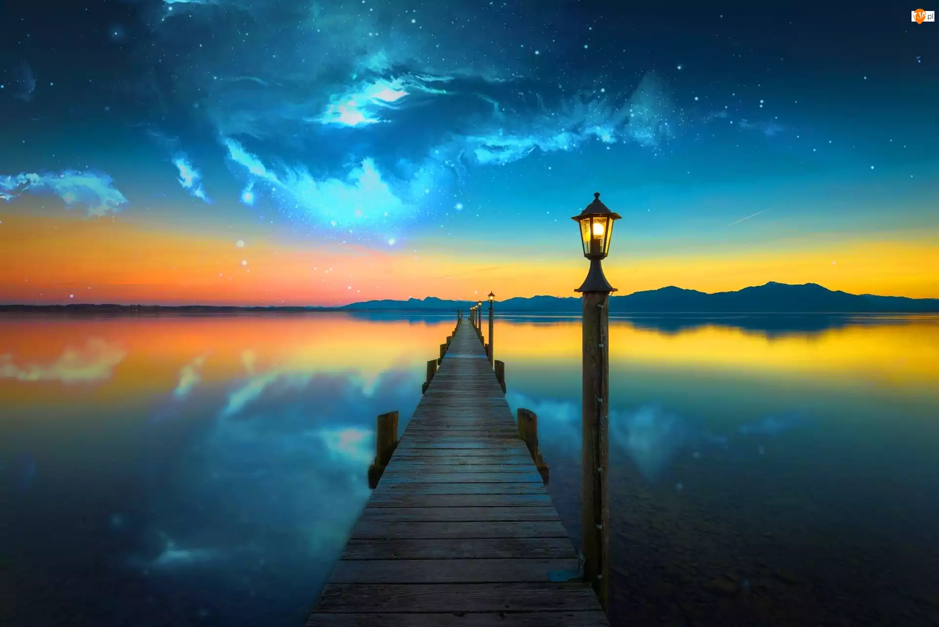 Jezioro, Zachód słońca, Pomost, Lampa