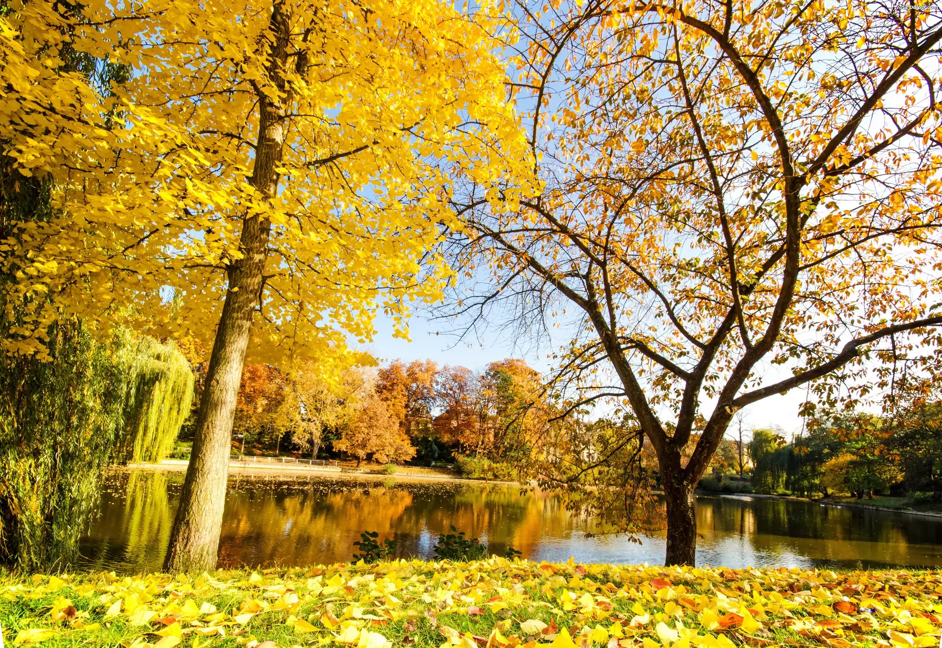 Kaczki, Liście, Park, Jesień, Staw, Drzewa