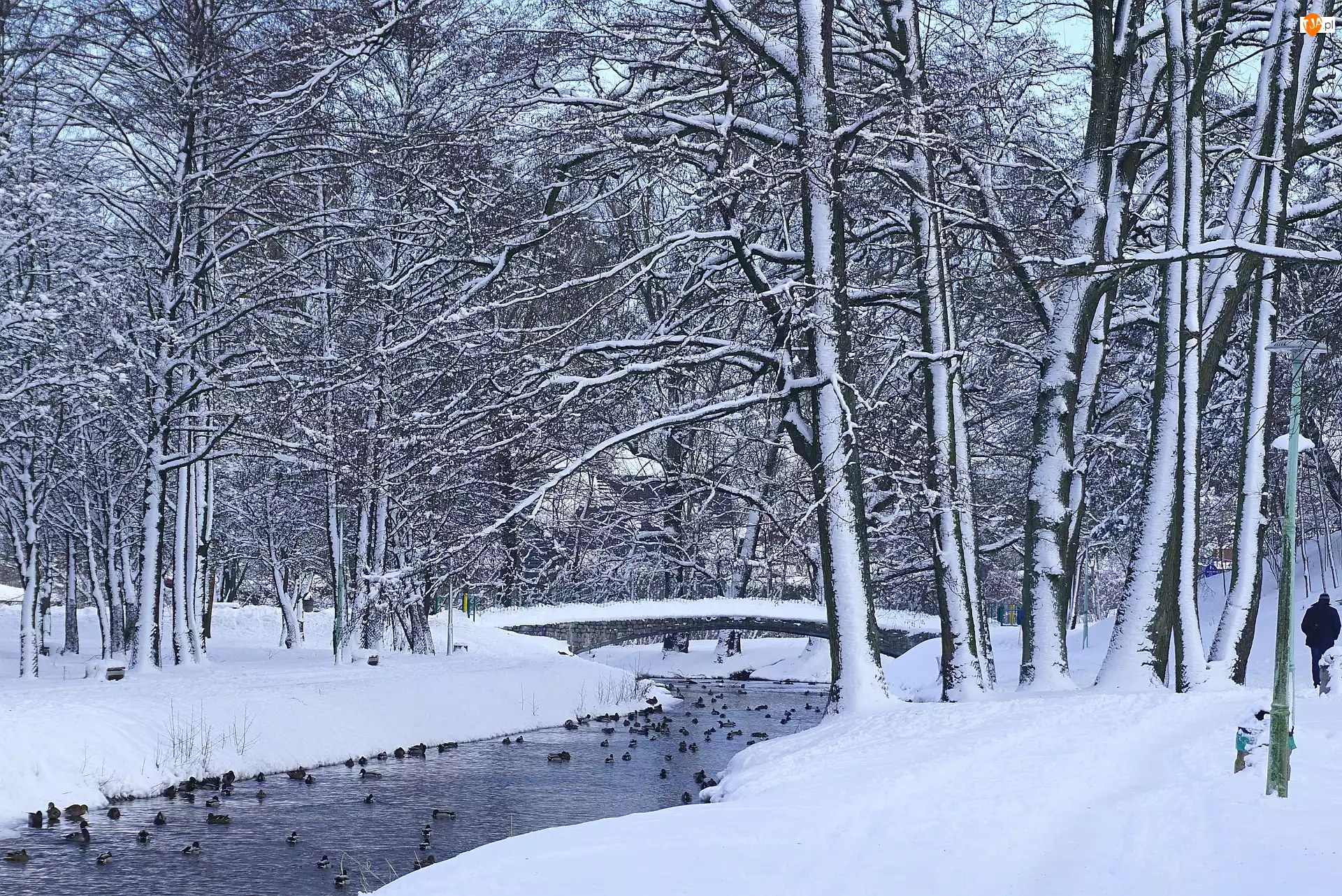Park, Zima, Rzeka, Kaczki, Drzewa, Mostek