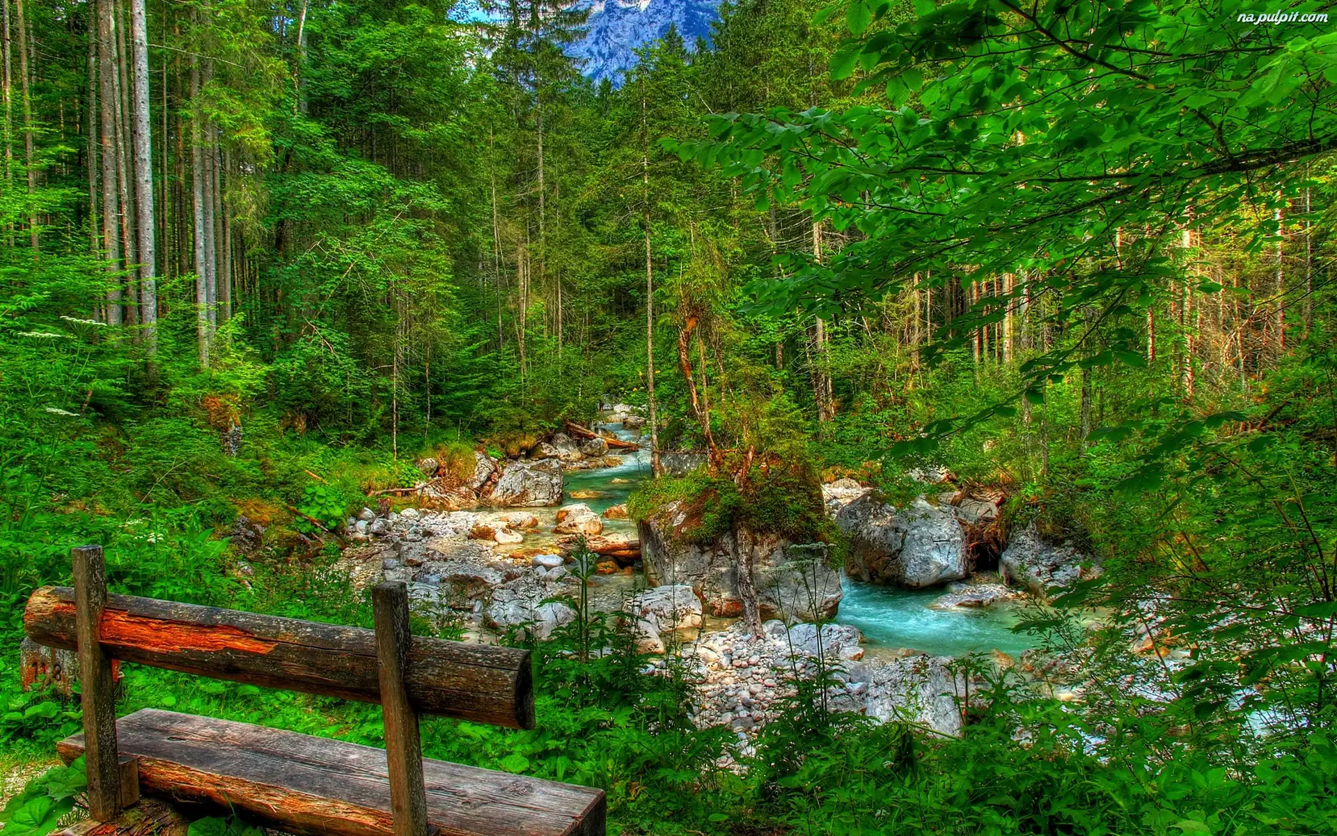 Kamienie, Góry, Las, HDR, Potok, Ławka