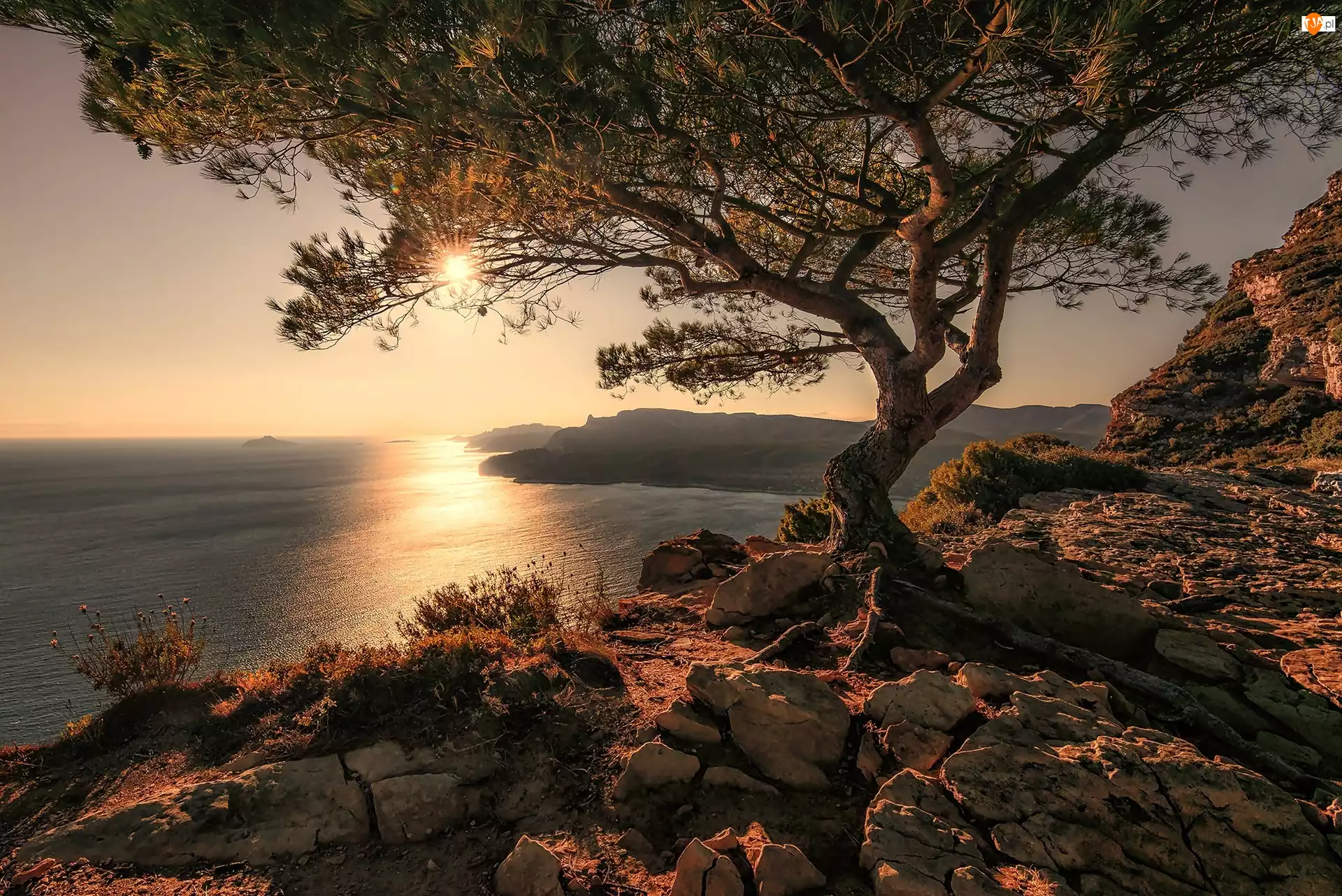 Kamienie, Świt, Wybrzeże, Morze, Sosna