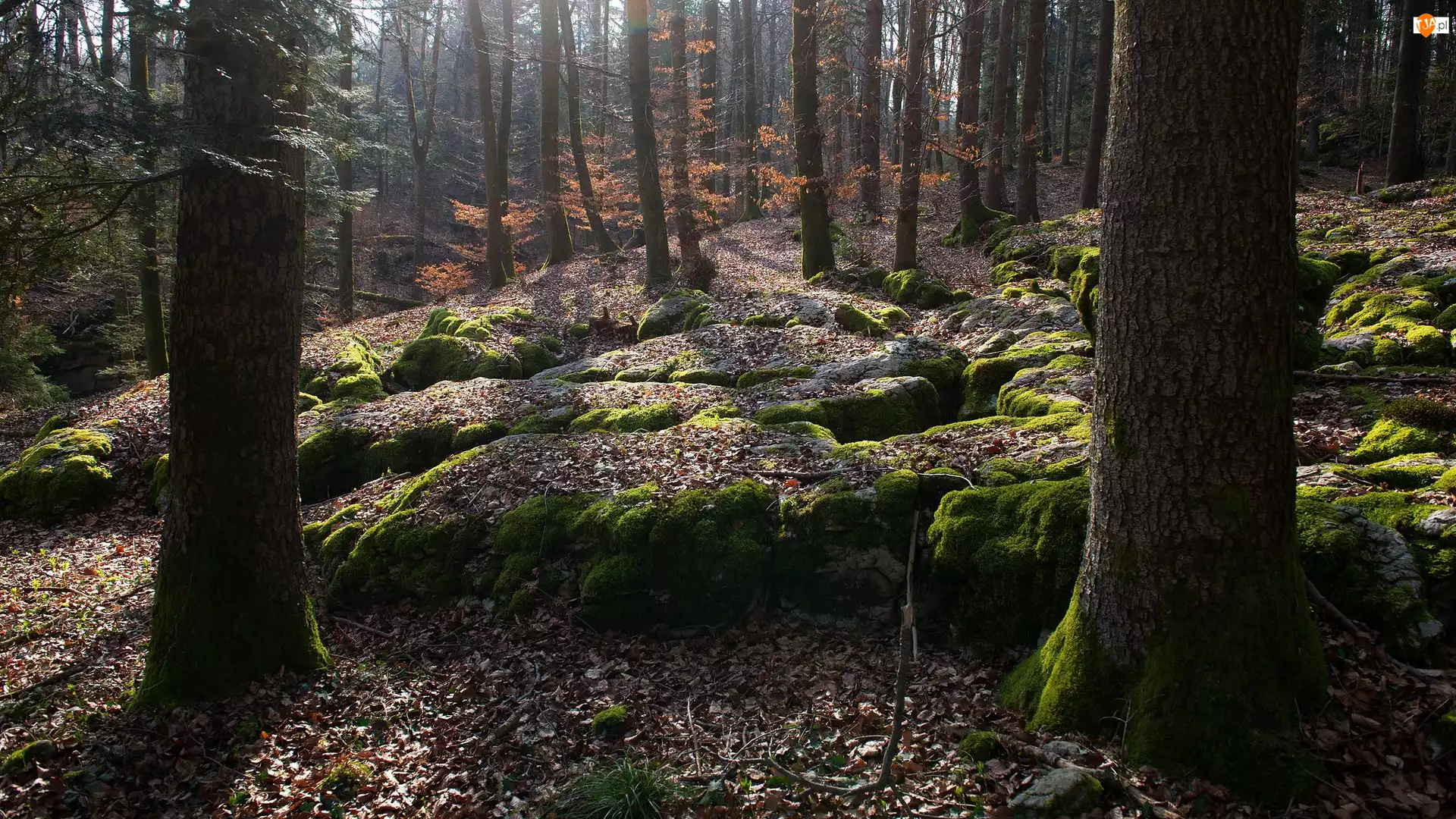 Kamienie, Liście, Omszałe, Las, Drzewa