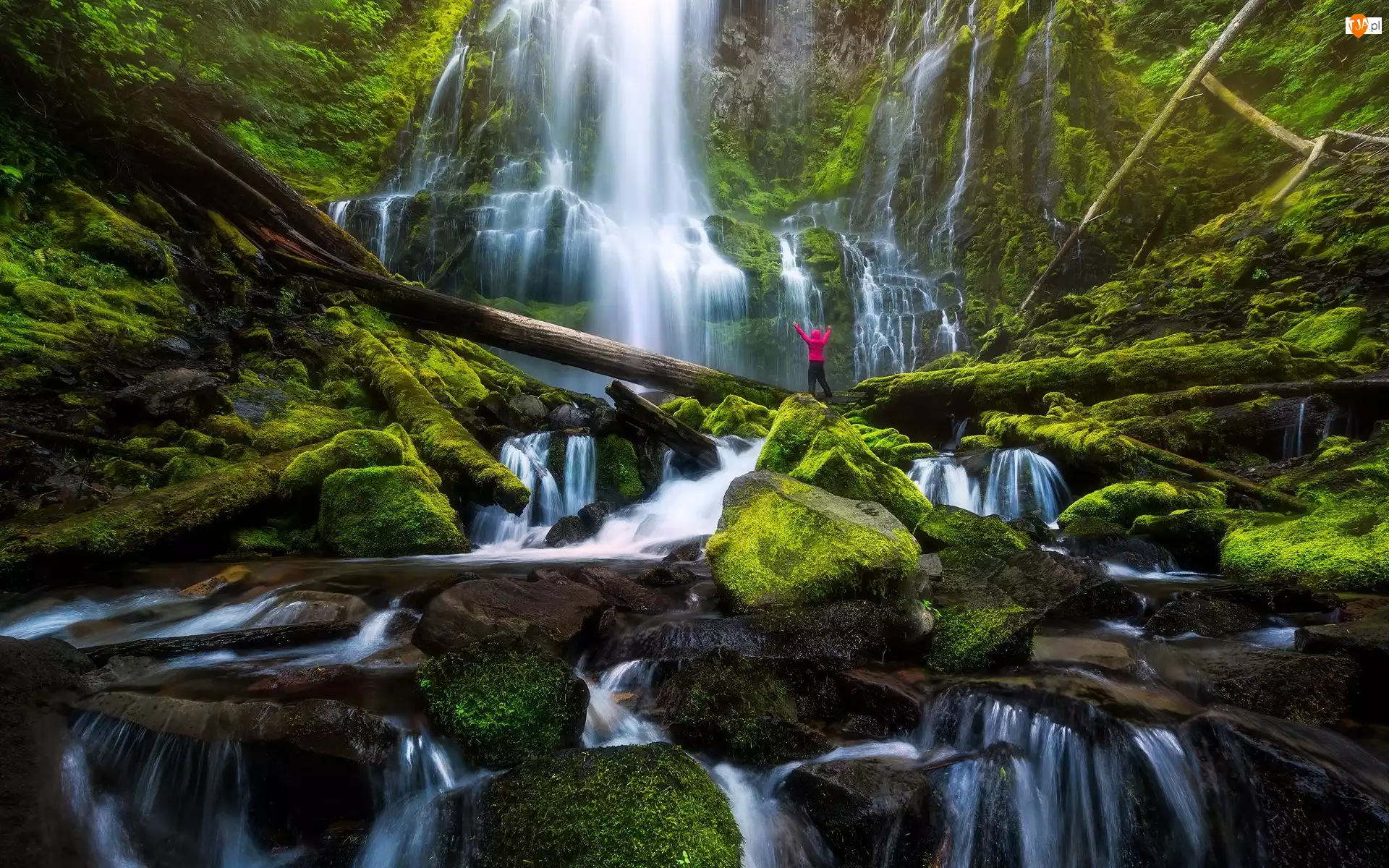Kamienie, Stany Zjednoczone, Proxy Falls, Konary, Stan Oregon, Omszałe, Człowiek, Wodospad