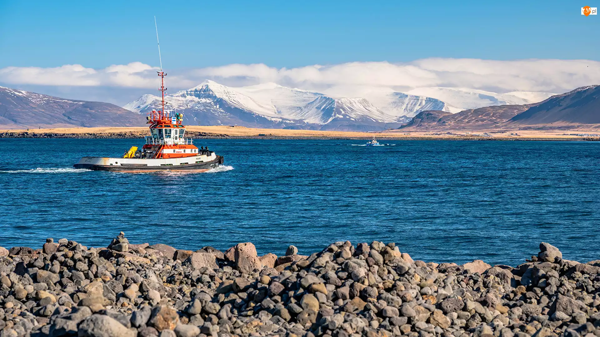 Góry, Ośnieżone, Motorówka, Brzeg, Morze, Kamienisty
