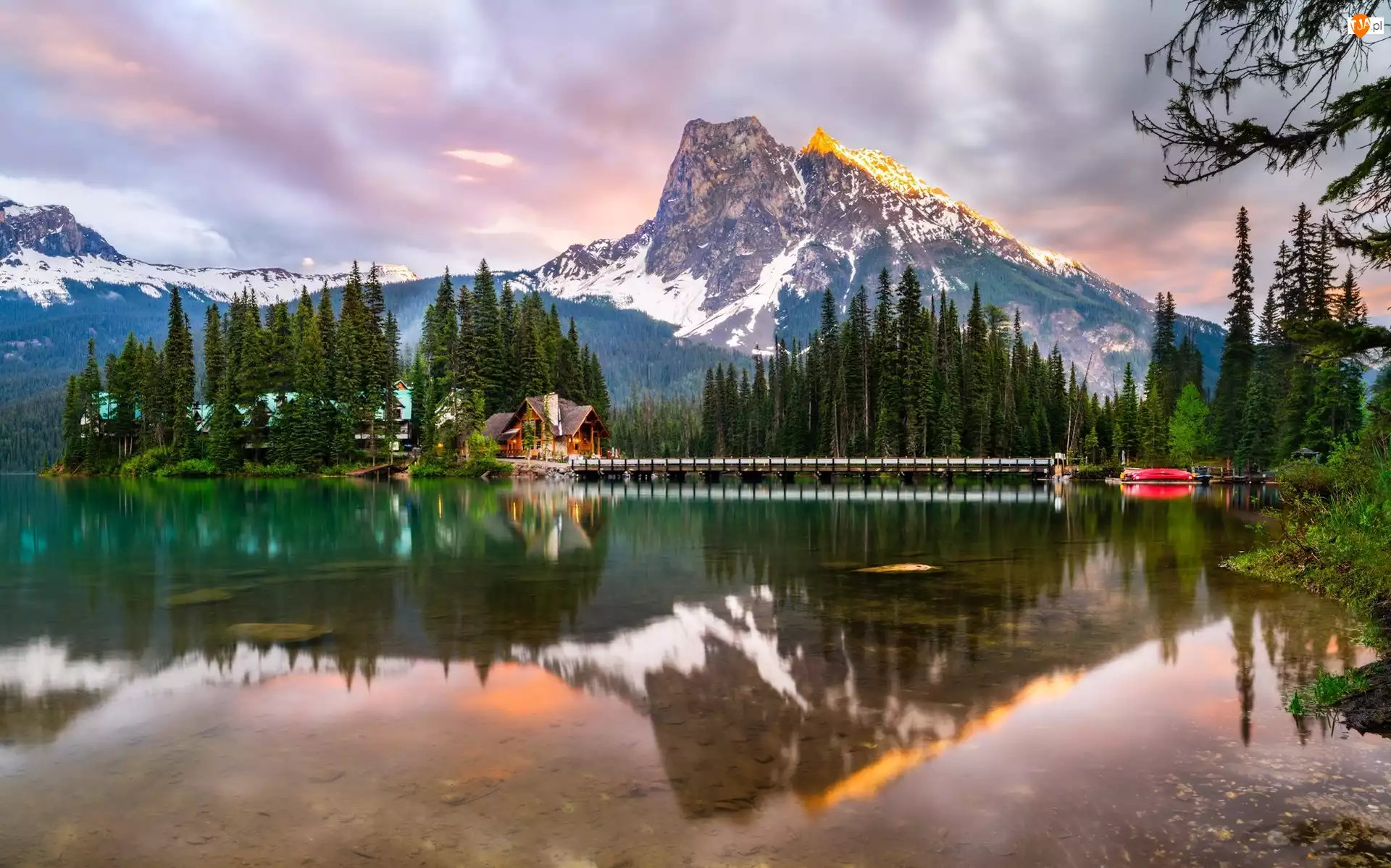 Kanada, Dom, Kolumbia Brytyjska, Góry, Drzewa, Most, Jezioro, Park Narodowy Yoho, Emerald Lake