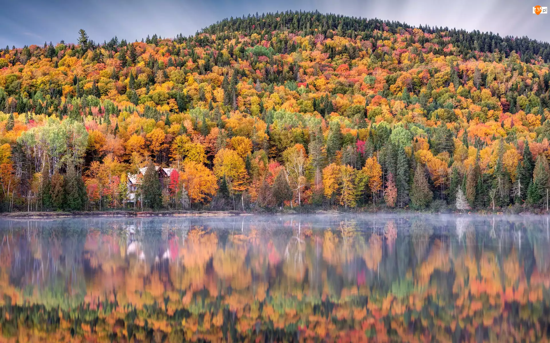 Kanada, Dom, Odbicie, Mgła, Las, Park Narodowy La Mauricie, Jesień, Drzewa, Jezioro, Quebec