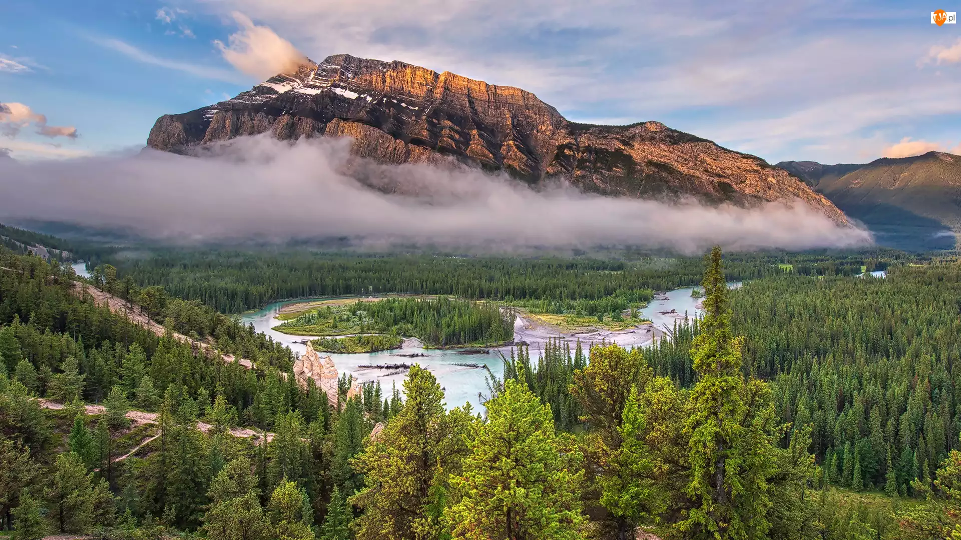Kanada, Góry, Park Narodowy Banff, Lasy, Rzeka, Alberta, Chmury, Bow River
