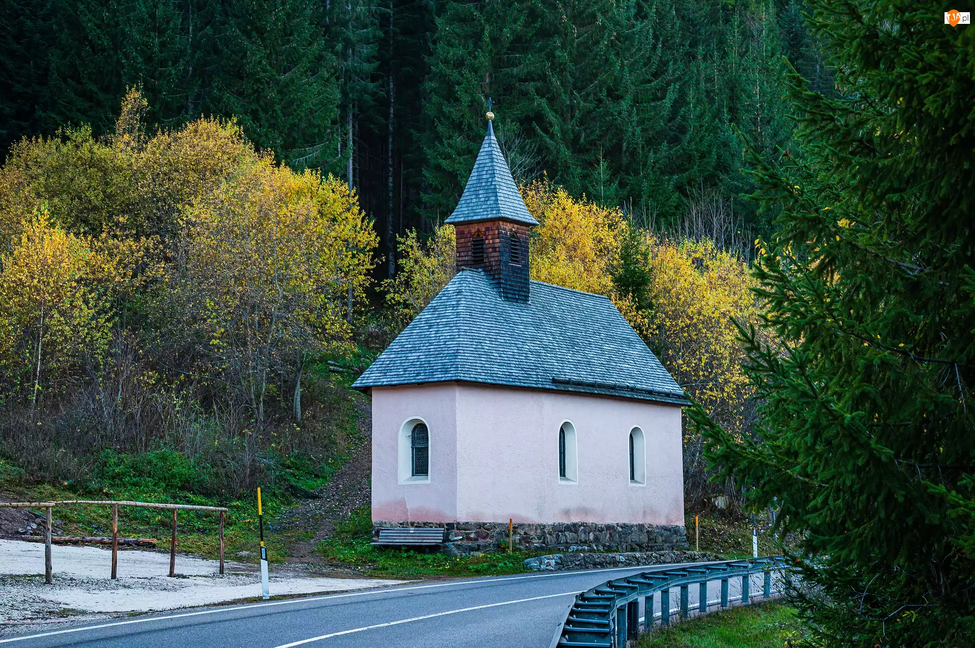 Kościół, Kapliczka, Drzewa, Jesień, Droga, Las