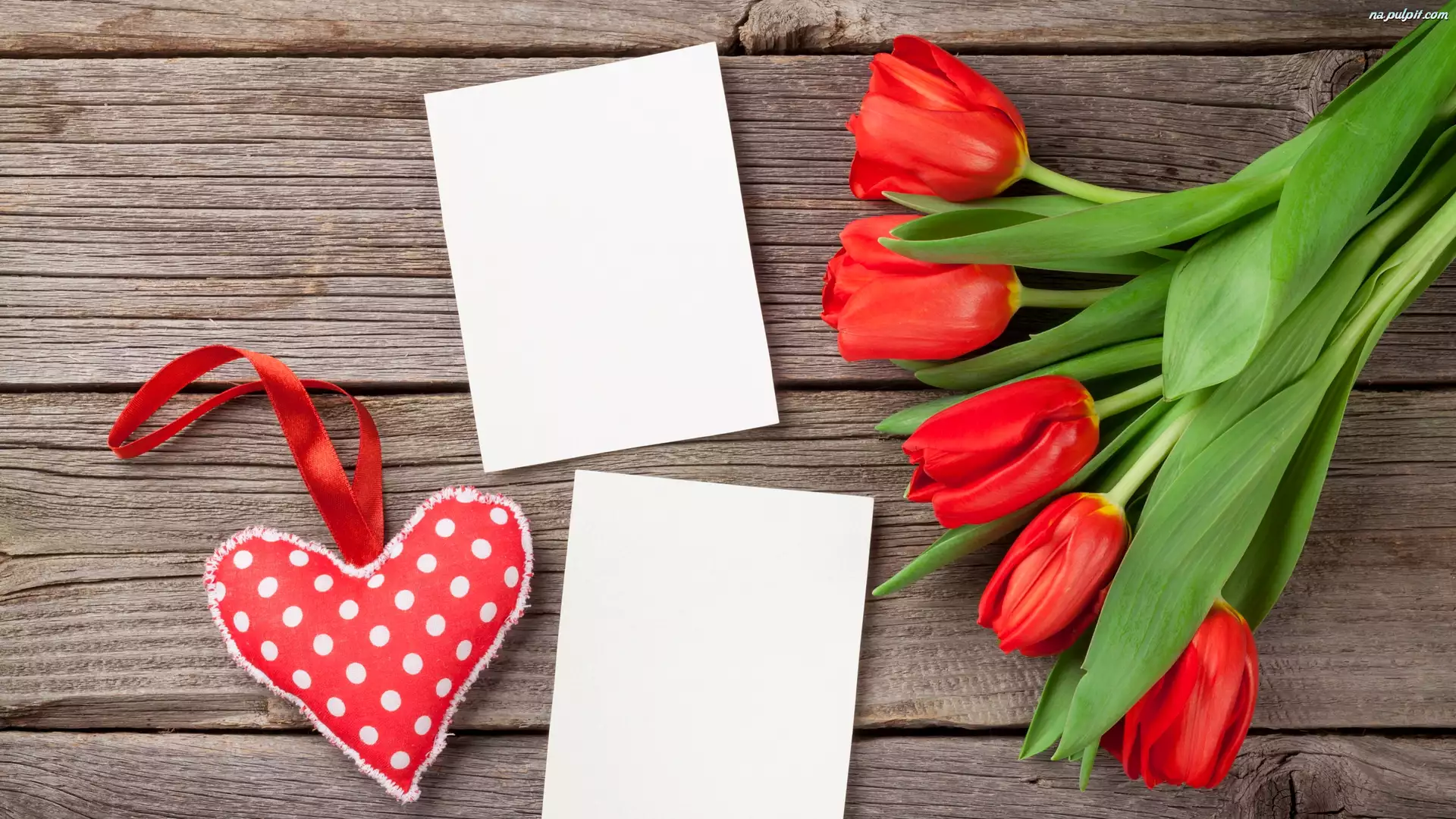 Tulipany, Czerwone, Kartki, Deski, Białe, Serce