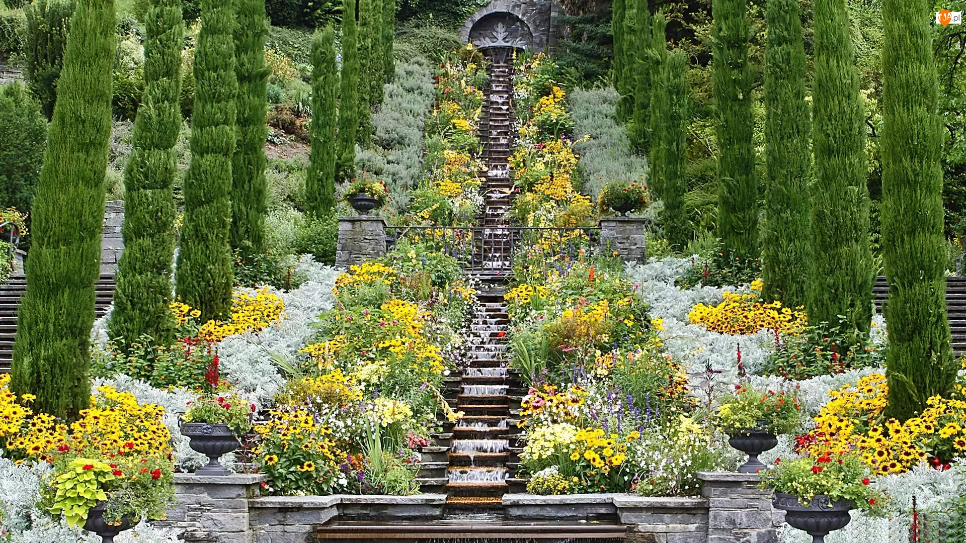 Kaskada, Ogród, Kwiaty, Kolorowe, Iglaki