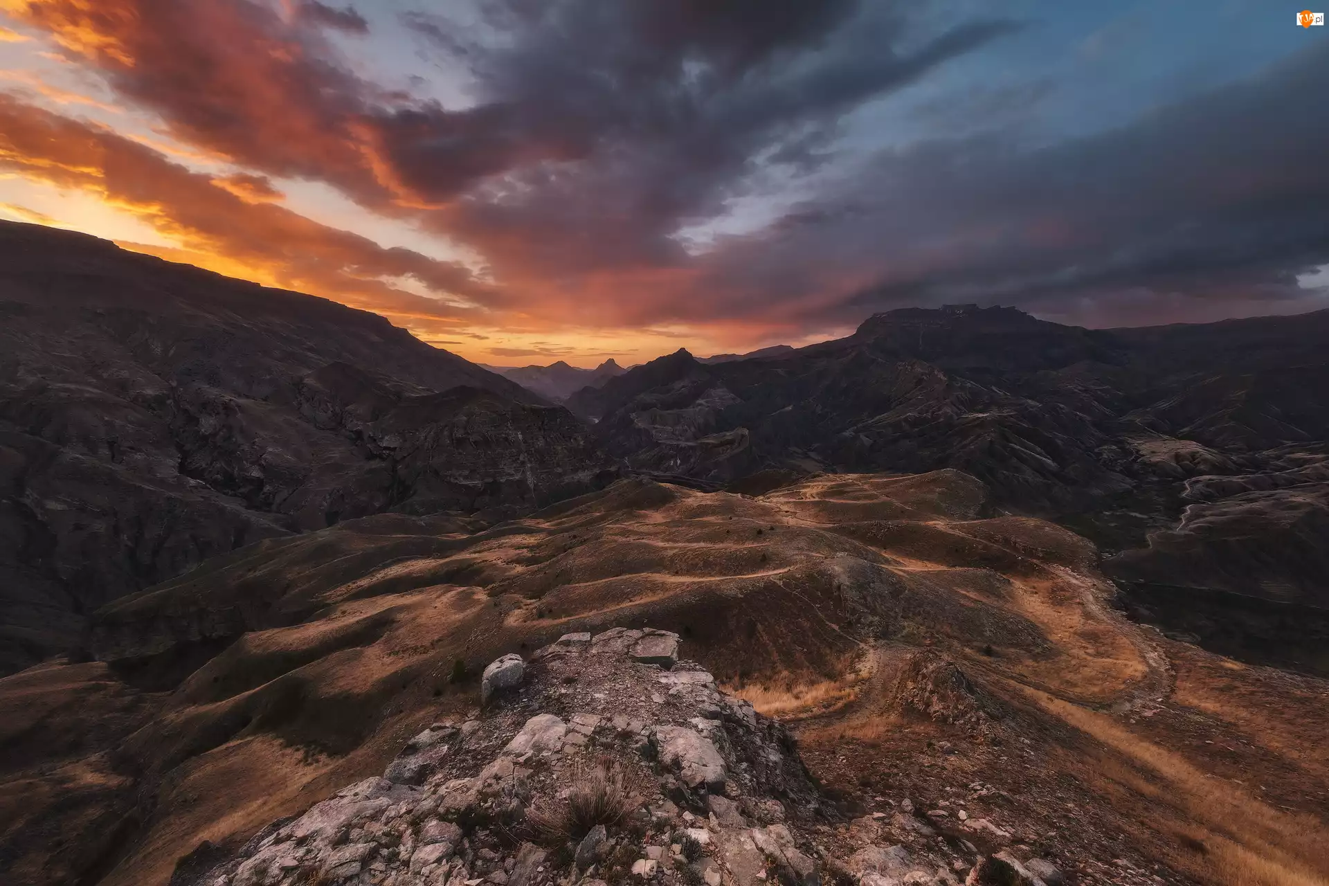 Kaukaz, Wąwozy, Rosja, Góry, Republika Dagestanu, Chmury, Skały