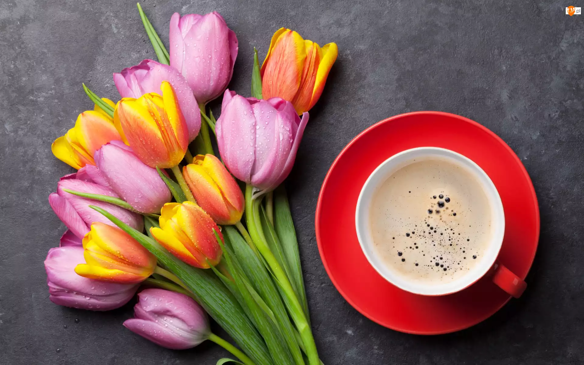 Bukiet, Filiżanka, Tulipany, Kwiaty, Kawa