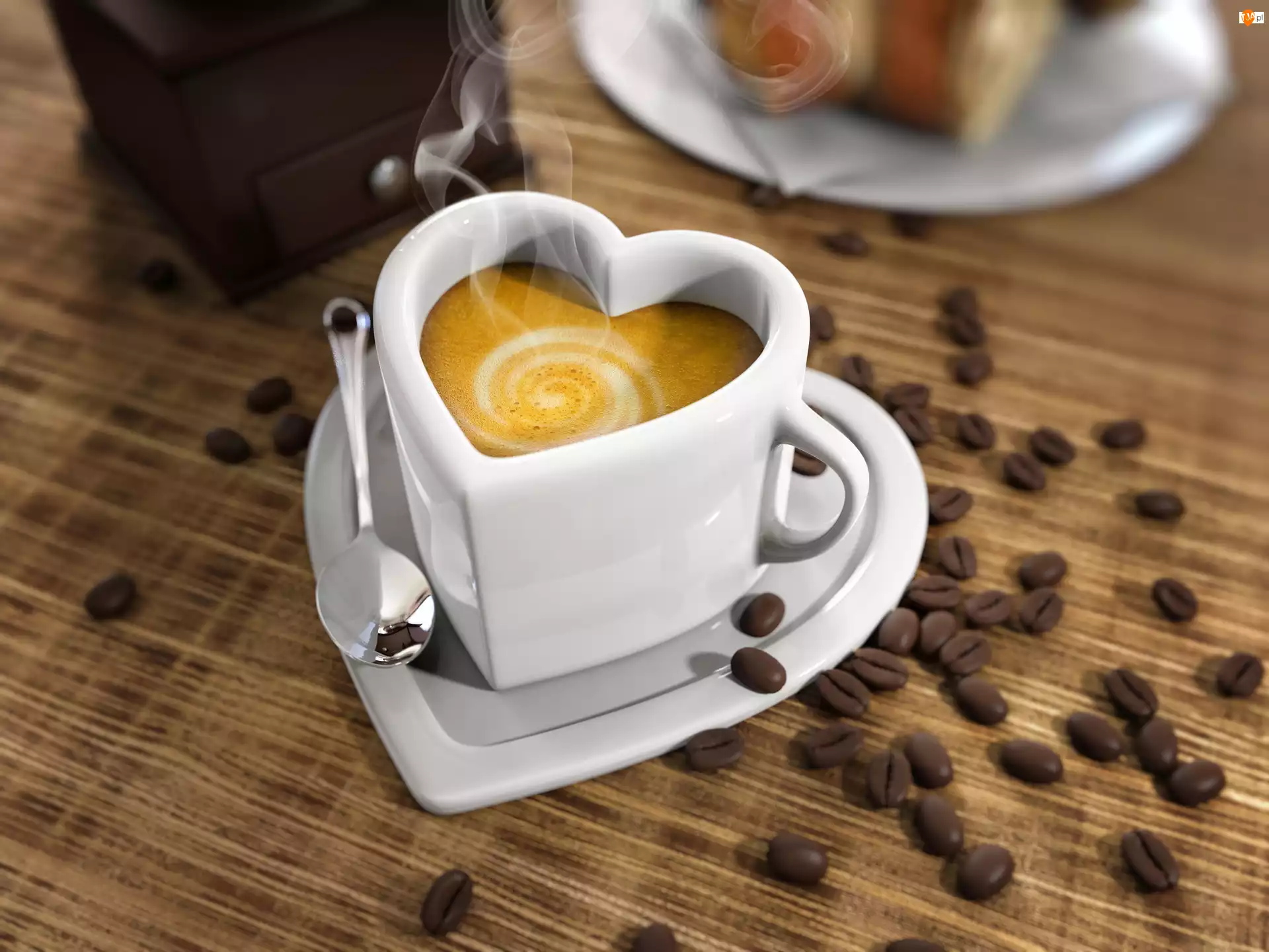 Serce, Filiżanka, Łyżeczka, Ziarna, Spodek, Kawa