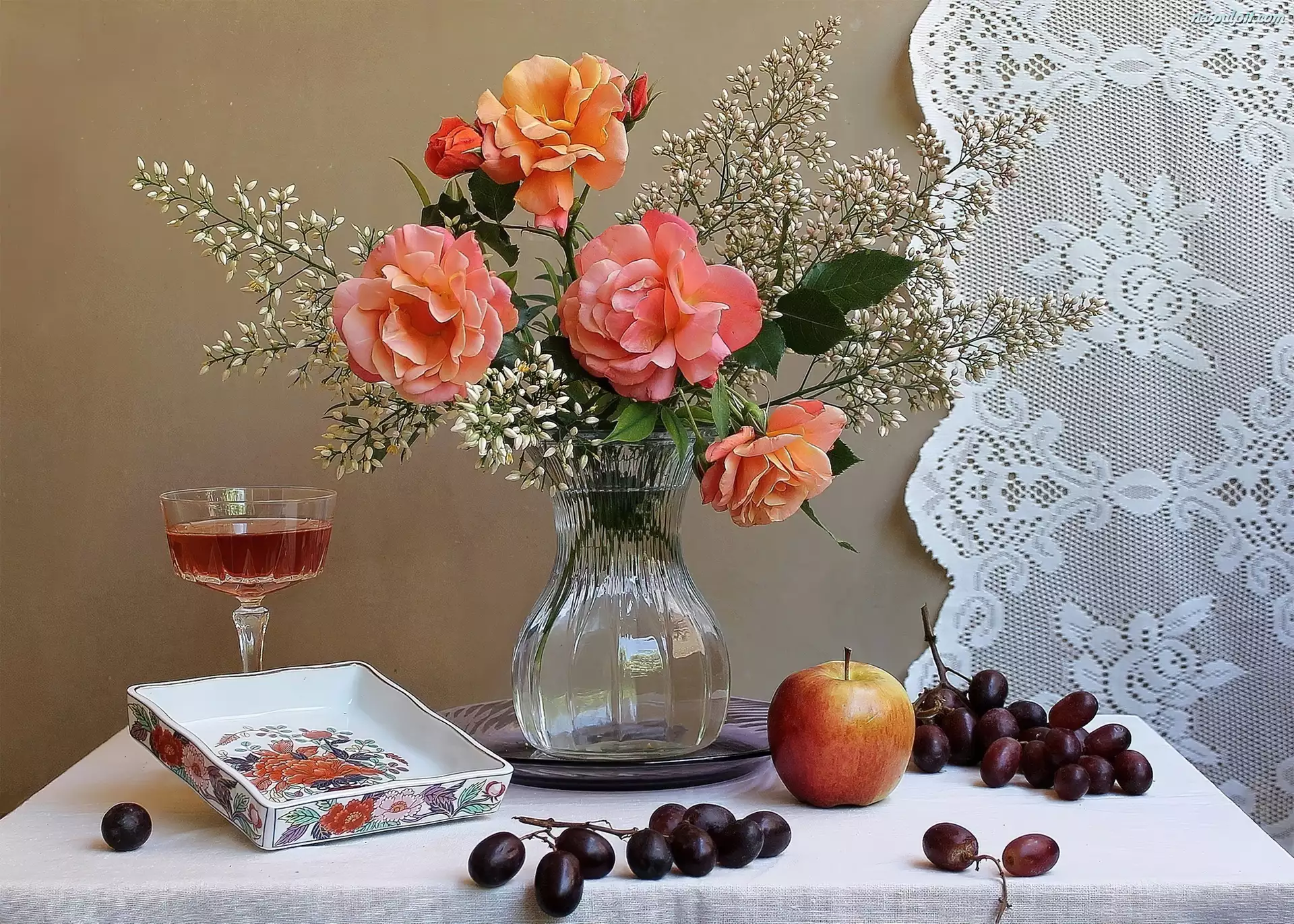Kieliszek, Kompozycja, Jabłko, Róże, Winogrona