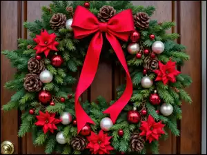 Bombki, Boże Narodzenie, Kwiaty, Wstążka, Wianek, Czerwon